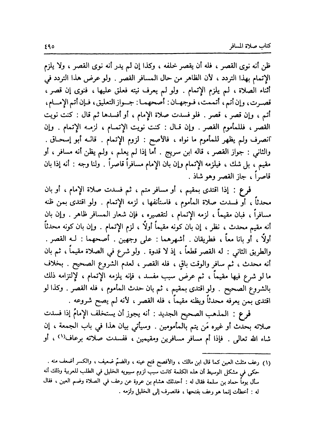 ظن أنه نوى القصر، فله أن يقصر خلفه، وكذا إن لم يدر أنه نوى القصر، ولا يلزم الاتمام بهذا التردد، لان الظاهر من حال المسافر القصر. ولو عرض هذا التردد في أثناء الصلاة، لم يلزم الاتمام. ولو لم يعرف نيته فعلق عليها، فنوى إن قصر، قصرت، وإن أتم، أتممت، فوجهان: أصحهما: جواز التعليق، فإن أتم الامام، أتم، وإن قصر، قصر. فلو فسدت صلاة الامام، أو أفسدها ثم قال: كنت نويت القصر، فللمأموم القصر. وإن قال: كنت نويت الاتمام، لزمه الاتمام. وإن انصرف ولم يظهر للمأموم ما نواه، فالاصح: لزوم الاتمام. قاله أبو إسحاق. والثاني: جواز القصر، قاله ابن سريج. أما إذا لم يعلم، ولم يظن أنه مسافر، أو مقيم، بل شك، فيلزمه الاتمام وإن بان الامام مسافرا قاصرا. ولنا وجه: أنه إذا بان قاصرا، جاز القصر وهو شاذ. فرع: إذا اقتدى بمقيم، أو مسافر متم، ثم فسدت صلاة الامام، أو بان محدثا، أو فسدت صلاة المأموم، فاستأنفها، لزمه الاتمام. ولو اقتدى بمن ظنه مسافرا، فبان مقيما، لزمه الاتمام، لتقصيره، فإن شعار المسافر ظاهر. وإن بان أنه مقيم محدث، نظر، إن بان كونه مقيما أولا، لزم الاتمام. وإن بان كونه محدثا أولا أو بانا معا، فطريقان. أشهرهما: على وجهين. أصحهما: له القصر. والطريق الثاني: له القصر قطعا، إذ لا قدوة. ولو شرع في الصلاة مقيما، ثم بان أنه محدث، ثم سافر والوقت باق، فله القصر، لعدم الشروع الصحيح. بخلاف ما لو شرع فيها مقيما، ثم عرض سبب مفسد، فإنه يلزمه الاتمام، لالتزامه ذلك بالشروع الصحيح. ولو اقتدى بمقيم، ثم بان حدث المأموم، فله القصر. وكذا لو اقتدى بمن يعرفه محدثا ويظنه مقيما، فله القصر، لانه لم يصح شروعه. فرع: المذهب الصحيح الجديد: أنه يجوز أن يستخلف الامام إذا فسدت صلاته بحدث أو غيره من يتم بالمأمومين. وسيأتي بيان هذا في باب الجمعة، إن شاء الله تعالى. فإذا أم مسافر مسافرين ومقيمين، ففسدت صلاته برعاف (1)، أو
