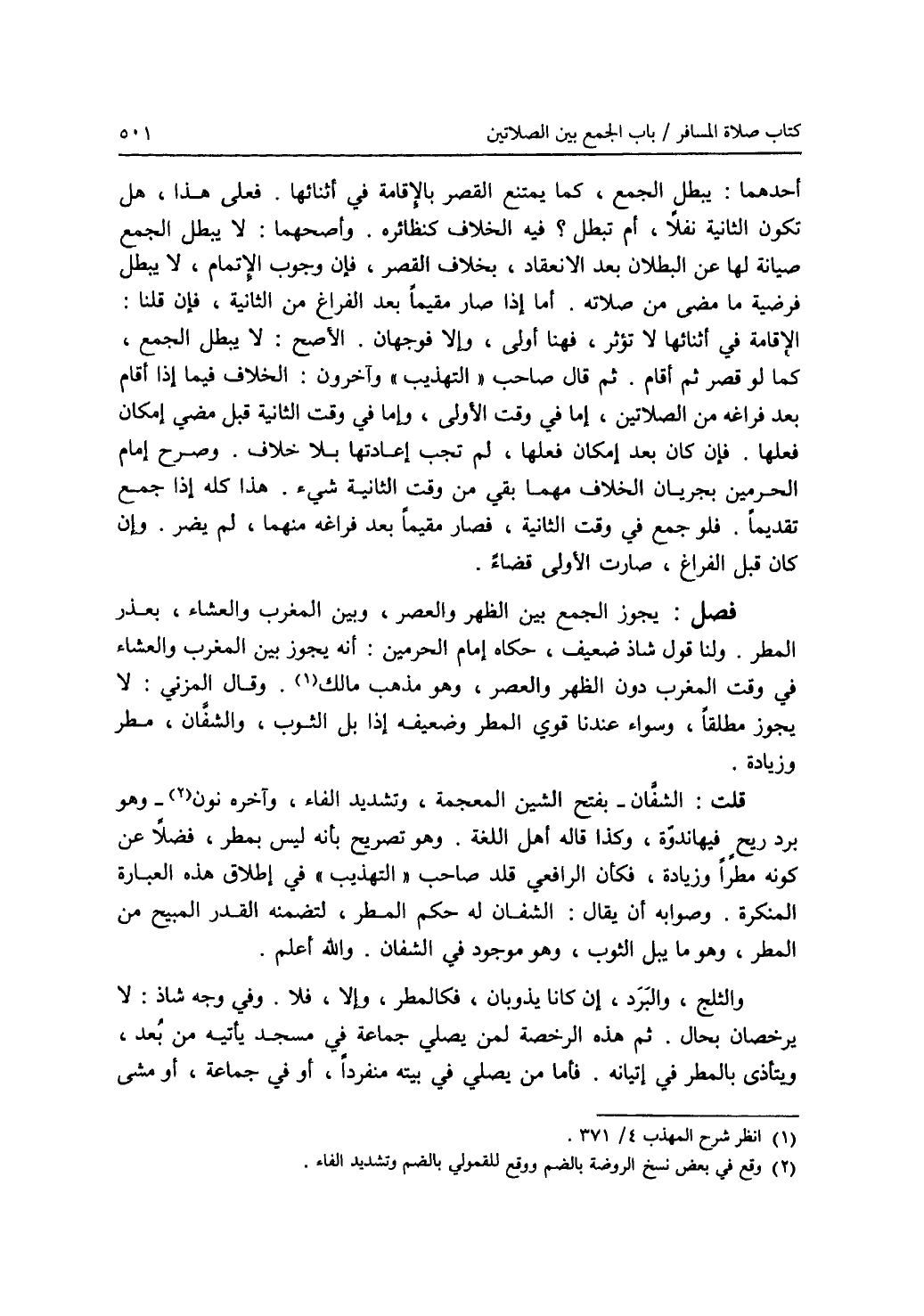 أحدهما: يبطل الجمع، كما يمتنع القصر بالاقامة في أثنائها. فعلى هذا، هل تكون الثانية نفلا، أم تبطل ؟ فيه الخلاف كنظائره. وأصحهما: لا يبطل الجمع صيانة لها عن البطلان بعد الانعقاد، بخلاف القصر، فإن وجوب الاتمام، لا يبطل فرضية ما مضى من صلاته. أما إذا صار مقيما بعد الفراغ من الثانية، فإن قلنا: الاقامة في أثنائها لا تؤثر، فهنا أولى، وإلا فوجهان. الاصح: لا يبطل الجمع، كما لو قصر ثم أقام. ثم قال صاحب (التهذيب) وآخرون: الخلاف فيما إذا أقام بعد فراغه من الصلاتين، إما في وقت الاولى، وإما في وقت الثانية قبل مضي إمكان فعلها. فإن كان بعد إمكان فعلها، لم تجب إعادتها بلا خلاف. وصرح إمام الحرمين بجريان الخلاف مهما بقي من وقت الثانية شئ. هذا كله إذا جمع تقديما. فلو جمع في وقت الثانية، فصار مقيما بعد فراغه منهما، لم يضر. وإن كان قبل الفراغ، صارت الاولى قضاء. فصل: يجوز الجمع بين الظهر والعصر، وبين المغرب والعشاء، بعذر المطر. ولنا قول شاذ ضعيف، حكاه إمام الحرمين: أنه يجوز بين المغرب والعشاء في وقت المغرب دون الظهر والعصر، وهو مذهب مالك (1). وقال المزني: لا يجوز مطلقا، وسواء عندنا قوي المطر وضعيفه إذا بل الثوب، والشفان، مطر وزيادة. قلت: الشفان - بفتح الشين المعجمة، وتشديد الفاء، وآخره نون (2) - وهو برد ريح فيه ندوة، وكذا قاله أهل اللغة. وهو تصريح بأنه ليس بمطر، فضلا عن كونه مطرا وزيادة، فكأن الرافعي قلد صاحب (التهذيب) في إطلاق هذه العبارة المنكرة. وصوابه أن يقال: الشفان له حكم المطر، لتضمنه القدر المبيح من المطر، وهو ما يبل الثوب، وهو موجود في الشفان. والله أعلم. والثلج، والبرد، إن كانا يذوبان، فكالمطر، وإلا، فلا. وفي وجه شاذ: لا يرخصان بحال. ثم هذه الرخصة لمن يصلي جماعة في مسجد يأتيه من بعد، ويتأذى بالمطر في إتيانه. فأما من يصلي في بيته منفردا، أو في جماعة، أو مشى