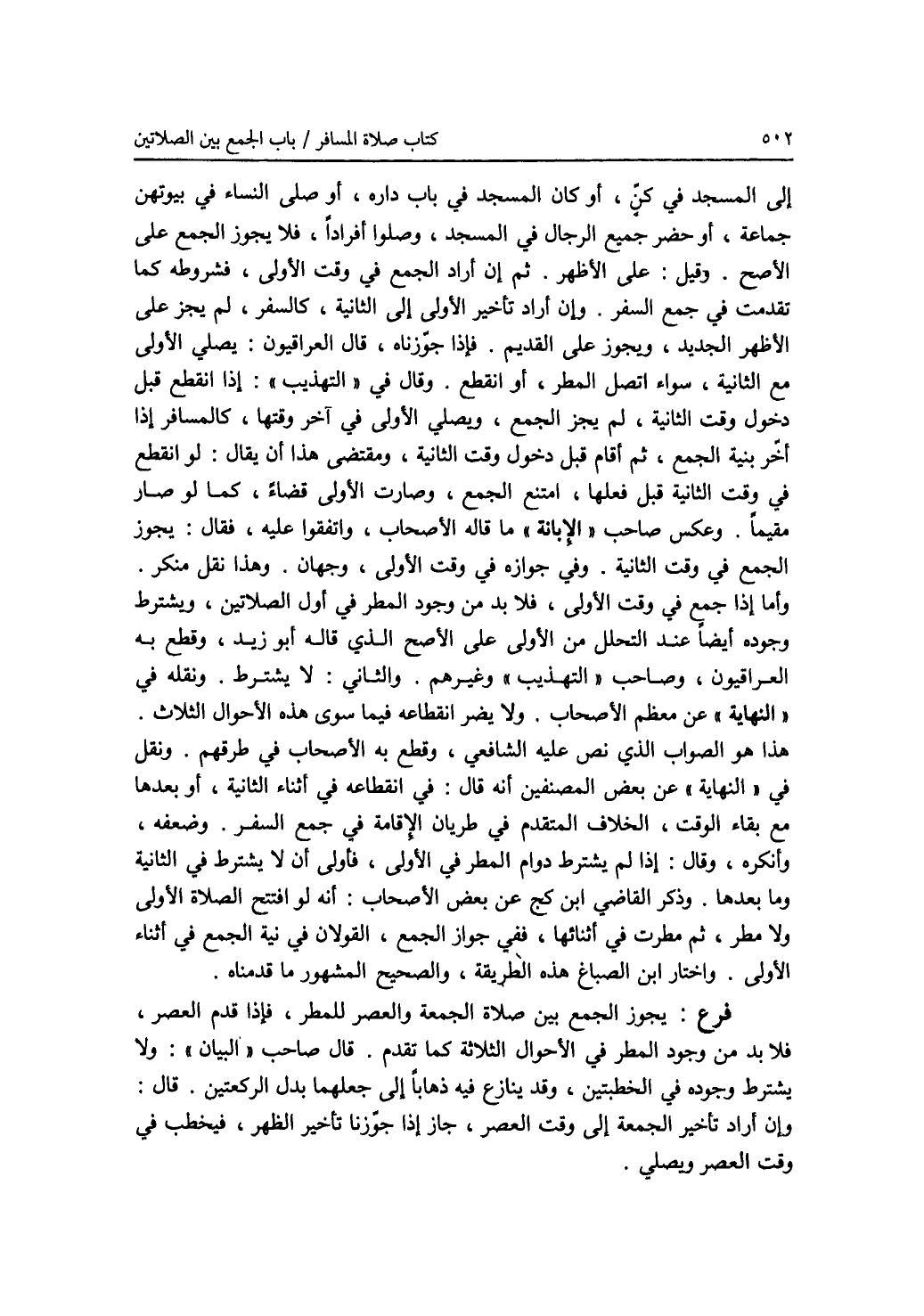 إلى المسجد في كن، أو كان المسجد في باب داره، أو صلى النساء في بيوتهن جماعة، أو حضر جميع الرجال في المسجد، وصلوا أفرادا، فلا يجوز الجمع على الاصح. وقيل: على الاظهر. ثم إن أراد الجمع في وقت الاولى، فشروطه كما تقدمت في جمع السفر. وإن أراد تأخير الاولى إلى الثانية، كالسفر، لم يجز على الاظهر الجديد، ويجوز على القديم. فإذا جوزناه، قال العراقيون: يصلي الاولى مع الثانية، سواء اتصل المطر، أو انقطع. وقال في (التهذيب): إذا انقطع قبل دخول وقت الثانية، لم يجز الجمع، ويصلي الاولى في آخر وقتها، كالمسافر إذا أخر بنية الجمع، ثم أقام قبل دخول وقت الثانية، وقتضى هذا أن يقال: لو انقطع في وقت الثانية قبل فعلها، امتنع الجمع، وصارت الاولى قضاء، كما لو صار مقيما. وعكس صاحب (الابانة) ما قاله الاصحاب، واتفقوا عليه، فقال: يجوز الجمع في وقت الثانية. وفي جوازه في وقت الاولى، وجهان. وهذا نقل منكر. وأما إذا جمع في وقت الاولى، فلا بد من وجود المطر في أول الصلاتين، ويشترط وجوده أيضا عند التحلل من الاولى على الاصح الذي قاله أبو زيد، وقطع به العراقيون، وصاحب (التهذيب) وغيرهم. والثاني: لا يشترط. ونقله في (النهاية) عن معظم الاصحاب. ولا يضر انقطاعه فيما سوى هذه الاحوال الثلاث. هذا هو الصواب الذي نص عليه الشافعي، وقطع به الاصحاب في طرقهم. ونقل في (النهاية) عن بعض المصنفين أنه قال: في انقطاعه في أثناء الثانية، أو بعدها مع بقاء الوقت، الخلاف المتقدم في طريان الاقامة في جمع السفر. وضعفه، وأنكره، وقال: إذا لم يشترط دوام المطر في الاولى، فأولى أن لا يشترط في الثانية وما بعدها. وذكر القاضي ابن كج عن بعض الاصحاب: أنه لو افتتح الصلاة الاولى ولا مطر، ثم مطرت في أثنائها، ففي جواز الجمع، القولان في نية الجمع في أثناء الاولى. واختار ابن الصباغ هذه الطريقة، والصحيح المشهور ما قدمناه. فرع: يجوز الجمع بين صلاة الجمعة والعصر للمطر، فإذا قدم العصر، فلا بد من وجود المطر في الاحوال الثلاثة كما تقدم. قال صاحب (البيان): ولا يشترط وجوده في الخطبتين، وقد ينازع فيه ذهابا إلى جعلهما بدل الركعتين. قال: وإن أراد تأخير الجمعة إلى وقت العصر، جاز إذا جوزنا تأخير الظهر، فيخطب في وقت العصر ويصلي.