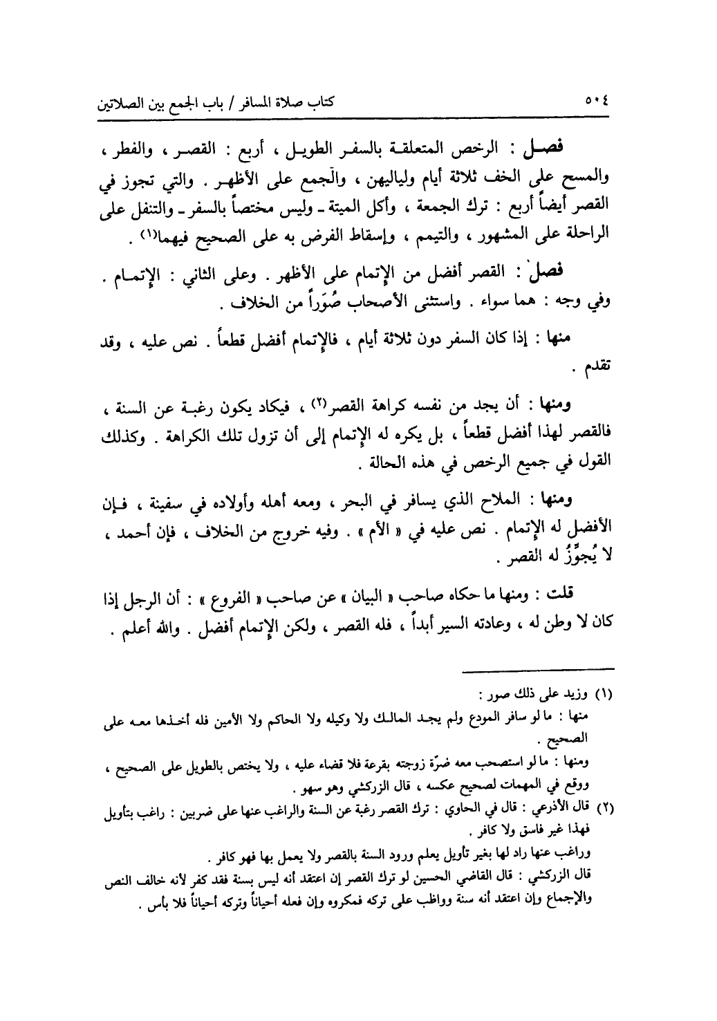 فصل: الرخص المتعلقة بالسفر الطويل، أربع: القصر، والفطر، والمسح على الخف ثلاثة أيام ولياليهن، والجمع على الاظهر. والتي تجوز في القصر أيضا أربع: ترك الجمعة، وأكل الميتة - وليس مختصا بالسفر - والتنفل على الراحلة على المشهور، والتيمم، وإسقاط الفرض به على الصحيح فيهما (1). فصل: القصر أفضل من الاتمام على الاظهر. وعلى الثاني: الاتمام. وفي وجه: هما سواء. واستثنى الاصحاب صورا من الخلاف. منها: إذا كان السفر دون ثلاثة أيام، فالاتمام أفضل قطعا. نص عليه، وقد تقدم. ومنها: أن يجد من نفسه كراهة القصر (2)، فيكاد يكون رغبة عن السنة، فالقصر لهذا أفضل قطعا، بل يكره له الاتمام إلى أن تزول تلك الكراهة. وكذلك القول في جميع الرخص في هذه الحالة. ومنها: الملاح الذي يسافر في البحر، ومعه أهله وأولاده في سفينة، فإن الافضل له الاتمام. نص عليه في (الام). وفيه خروج من الخلاف، فإن أحمد، لا يجوز له القصر. قلت: ومنها ما حكاه صاحب (البيان) عن صاحب (الفروع): أن الرجل إذا كان لا وطن له، وعادته السير أبدا، فله القصر، ولكن الاتمام أفضل، والله أعلم.