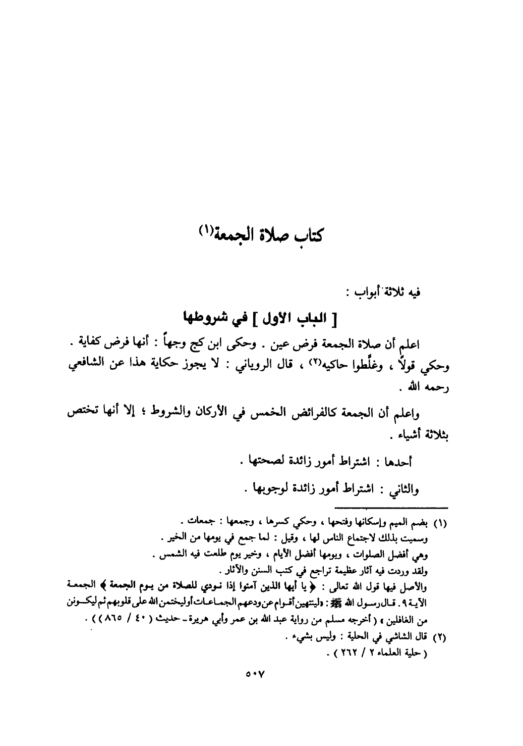 [ الباب الاول ] في شروطها اعلم أن صلاة الجمعة فرض عين. وحكى ابن كج وجها: أنها فرض كفاية. وحكي قولا، وغلطوا حاكيه (2)، قال الروياني: لا يجوز حكاية هذا عن الشافعي رحمه الله. واعلم أن الجمعة كالفرائض الخمس في الاركان والشروط، إلا أنها تختص بثلاثة أشياء. أحدها: اشتراط أمور زائدة لصحتها. والثاني: اشتراط أمور زائدة لوجوبها.