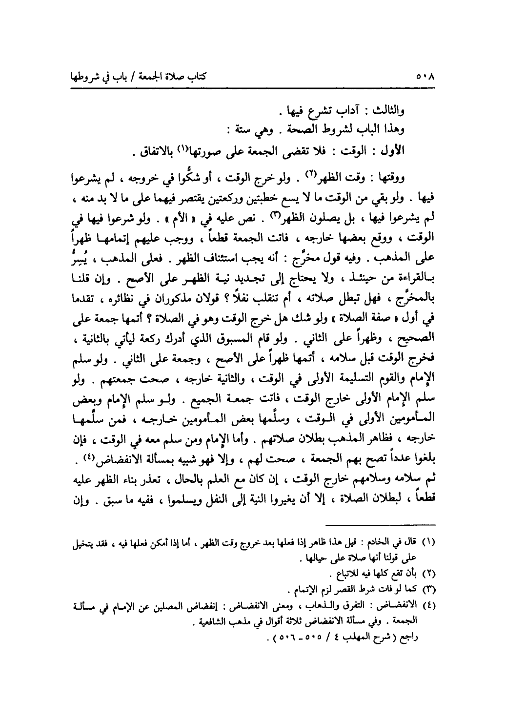 والثالث: آداب تشرع فيها. وهذا الباب لشروط الصحة. وهي ستة: الاول: الوقت: فلا تقضى الجمعة على صورتها (1) بالاتفاق، ووقتها: وقت الظهر (2). ولو خرج الوقت، أو شكوا في خروجه، لم يشرعوا فيها. ولو بقي من الوقت ما لا يسع خطبتين وركعتين يقتصر فيهما على ما لا بد منه، لم يشرعوا فيها، بل يصلون الظهر (3). نص عليه في (الام). ولو شرعوا فيها في الوقت، ووقع بعضها خارجه، فاتت الجمعة قطعا، ووجب عليهم إتمامها ظهرا على المذهب. وفيه قول مخرج: أنه يجب استئناف الظهر. فعلى المذهب، يسر بالقراءة من حينئذ، ولا يحتاج إلى تجديد نية الظهر على الاصح. وإن قلنا بالمخرج، فهل تبطل صلاته، أم تنقلب نفلا ؟ قولان مذكوران في نظائره، تقدما في أول (صفة الصلاة) ولو شك هل خرج الوقت وهو في الصلاة ؟ أتمها جمعة على الصحيح، وظهرا على الثاني. ولو قام المسبوق الذي أدرك ركعة ليأتي بالثانية، فخرج الوقت قبل سلامه، أتمها ظهرا على الاصح، وجمعة على الثاني. ولو سلم الامام والقوم التسليمة الاولى في الوقت، والثانية خارجه، صحت جمعتهم. ولو سلم الامام الاولى خارج الوقت، فاتت جمعة الجميع. ولو سلم الامام وبعض المأمومين الاولى في الوقت، وسلمها بعض المأمومين خارجه، فمن سلمها خارجه، فظاهر المذهب بطلان صلاتهم. وأما الامام ومن سلم معه في الوقت، فإن بلغوا عددا تصح بهم الجمعة، صحت لهم، وإلا فهو شبيه بمسألة الانفضاض (4). ثم سلامه وسلامهم خارج الوقت، إن كان مع العلم بالحال، تعذر بناء الظهر عليه قطعا، لبطلان الصلاة، إلا أن يغيروا النية إلى النفل ويسلموا، ففيه ما سبق. وإن