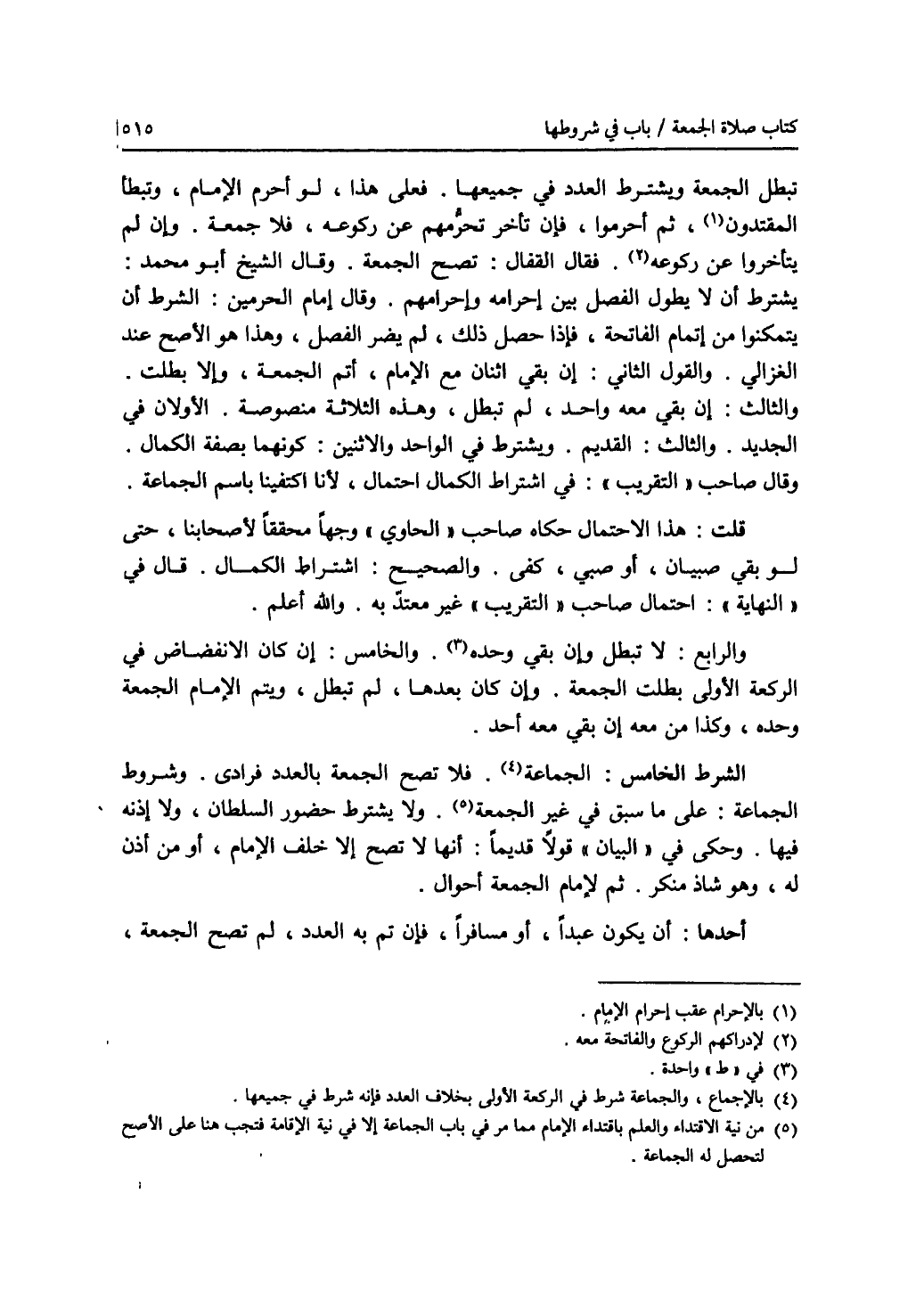 تبطل الجمعة ويشترط العدد في جميعها. فعلى هذا، لو أحرم الامام، وتبطأ المقتدون (1)، ثم أحرموا، فإن تأخر تحرمهم عن ركوعه، فلا جمعة. وإن لم يتأخروا عن ركوعه (2)، فقال القفال: تصح الجمعة. وقال الشيخ أبو محمد: يشترط أن لا يطول الفصل بين إحرامه وإحرامهم. وقال إمام الحرمين: الشرط أن يتمكنوا من إتمام الفاتحة، فإذا حصل ذلك، لم يضر الفصل، وهذا هو الاصح عند الغزالي. والقول الثاني: إن بقي اثنان مع الامام، أتم الجمعة، وإلا بطلت. والثالث: إن بقي معه واحد، لم تبطل، وهذه الثلاثة منصوصة. الاولان في الجديد. والثالث: القديم. ويشترط في الواحد والاثنين: كونهما بصفة الكمال. وقال صاحب (التقريب): في اشتراط الكمال احتمال، لانا اكتفينا باسم الجماعة. قلت: هذا الاحتمال حكاه صاحب (الحاوي) وجها محققا لاصحابنا، حتى لو بقي صبيان، أو صبي، كفى. والصحيح: اشتراط الكمال. قال في (النهاية): احتمال صاحب (التقريب) غير معتد به. والله أعلم. والرابع: لا تبطل وإن بقي واحدة (3). والخامس: إن كان الانفضاض في الركعة الاولى بطلت الجمعة. وإن كان بعدها، لم تبطل، ويتم الامام الجمعة وحده، وكذا من معه إن بقي معه أحد. الشرط الخامس: الجماعة (4). فلا تصح الجمعة بالعدد فرادى. وشروط الجماعة: على ما سبق في غير الجمعة (5). ولا يشترط حضور السلطان، ولا إذنه فيها. وحكى في (البيان) قولا قديما: إنها لا تصح إلا خلف الامام، أو من أذن له، وهو شاذ منكر. ثم لامام الجمعة أحوال. أحدها: أن يكون عبدا، أو مسافرا، فإن تم به العدد، لم تصح الجمعة،