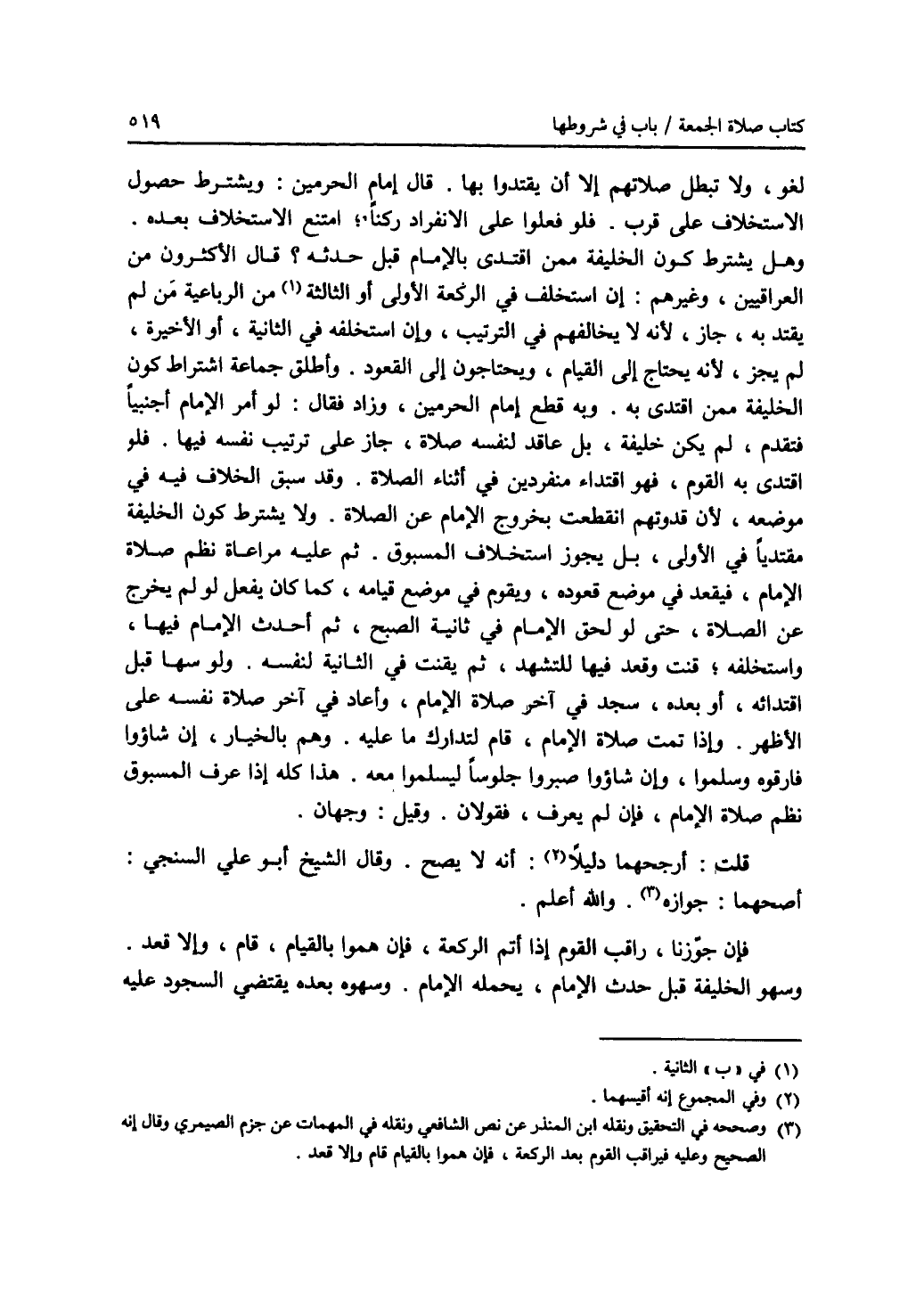 لغو، ولا تبطل صلاتهم إلا أن يقتدوا بها. قال إمام الحرمين: ويشترط حصول الاستخلاف على قرب. فلو فعلوا على الانفراد ركنا، امتنع الاستخلاف بعده. وهل يشترط كون الخليفة ممن اقتدى بالامام قبل حدثه ؟ قال الاكثرون من العراقيين، وغيرهم: إن استخلف في الركعة الاولى أو الثالثة (1) من الرباعية من لم يقتد به، جاز، لانه لا يخالفهم في الترتيب، وإن استخلفه في الثانية، أو الاخيرة، لم يجز، لانه يحتاج إلى القيام، ويحتاجون إلى القعود. وأطلق جماعة اشتراط كون الخليفة ممن اقتدى به. وبه قطع إمام الحرمين، وزاد فقال: لو أمر الامام أجنبيا فتقدم، لم يكن خليفة، بل عاقد لنفسه صلاة، جاز على ترتيب نفسه فيها. فلو اقتدى به القوم، فهو اقتداء منفردين في أثناء الصلاة. وقد سبق الخلاف فيه في موضعه، لان قدوتهم انقطعت بخروج الامام عن الصلاة. ولا يشترط كون الخليفة مقتديا في الاولى، بل يجوز استخلاف المسبوق. ثم عليه مراعاة نظم صلاة الامام، فيقعد في موضع قعوده، ويقوم في موضع قيامه، كما كان يفعل لو لم يخرج عن الصلاة، حتى لو لحق الامام في ثانية الصبح، ثم أحدث الامام فيها، واستخلفه، قنت وقعد فيها للتشهد، ثم يقنت في الثانية لنفسه. ولو سها قبل اقتدائه، أو بعده، سجد في آخر صلاة الامام، وأعاد في آخر صلاة نفسه على الاظهر. وإذا تمت صلاة الامام، قام لتدارك ما عليه. وهم بالخيار، إن شاؤوا فارقوه وسلموا، وإن شاؤوا صبروا جلوسا ليسلموا معه. هذا كله إذا عرف المسبوق نظم صلاة الامام، فإن لم يعرف، فقولان. وقيل: وجهان. قلت: أرجحهما دليلا (2): أنه لا يصح. وقال الشيخ أبو علي السنجي: أصحهما: جوازه (3). والله أعلم. فإن جوزنا، راقب القوم إذا أتم الركعة، فإن هموا بالقيام، قام، وإلا قعد. وسهو الخليفة قبل حدث الامام، يحمله الامام. وسهوه بعده يقتضي السجود عليه