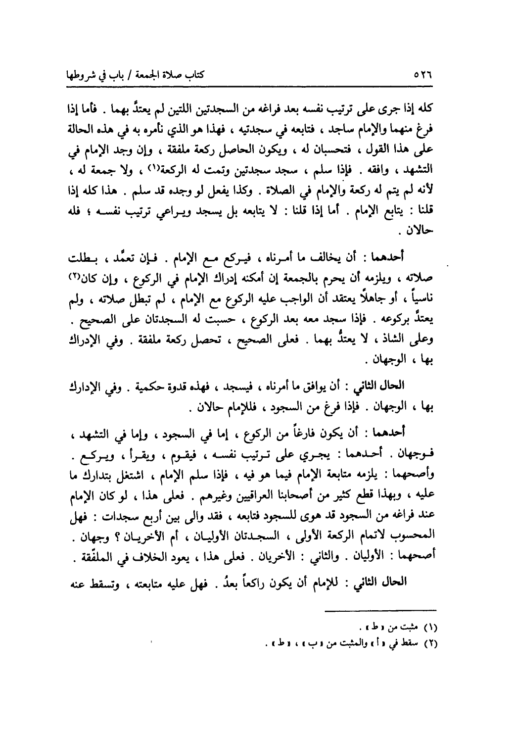 كله إذا جرى على ترتيب نفسه بعد فراغه من السجدتين اللتين لم يعتد بهما. فأما إذا فرغ منهما والامام ساجد، فتابعه في سجدتيه، فهذا هو الذي نأمره به في هذه الحالة على هذا القول، فتحسبان له، ويكون الحاصل ركعة ملفقة، وإن وجد الامام في التشهد، وافقه. فإذا سلم، سجد سجدتين وتمت له الركعة (1)، ولا جمعة له، لانه لم يتم له ركعة والامام في الصلاة. وكذا يفعل لو وجده قد سلم. هذا كله إذا قلنا: يتابع الامام. أما إذا قلنا: لا يتابعه بل يسجد ويراعي ترتيب نفسه، فله حالان. أحدهما: أن يخالف ما أمرناه، فيركع مع الامام. فإن تعمد، بطلت صلاته، ويلزمه أن يحرم بالجمعة إن أمكنه إدراك الامام في الركوع، وإن كان (2) ناسيا، أو جاهلا يعتقد أن الواجب عليه الركوع مع الامام، لم تبطل صلاته، ولم يعتد بركوعه. فإذا سجد معه بعد الركوع، حسبت له السجدتان على الصحيح. وعلى الشاذ، لا يعتد بهما. فعلى الصحيح، تحصل ركعة ملفقة. وفي الادراك بها، الوجهان. الحال الثاني: أن يوافق ما أمرناه، فيسجد، فهذه قدوة حكمية. وفي الادراك بها، الوجهان. فإذا فرغ من السجود، فللامام حالان. أحدهما: أن يكون فارغا من الركوع، إما في السجود، وإما في التشهد، فوجهان. أحدهما: يجري على ترتيب نفسه، فيقوم، ويقرأ، ويركع. وأصحهما: يلزمه متابعة الامام فيما هو فيه، فإذا سلم الامام، اشتغل بتدارك ما عليه، وبهذا قطع كثير من أصحابنا العراقيين وغيرهم. فعلى هذا، لو كان الامام عند فراغه من السجود قد هوى للسجود فتابعه، فقد والى بين أربع سجدات: فهل المحسوب لاتمام الركعة الاولى، السجدتان الاوليان، أم الاخريان ؟ وجهان. أصحهما: الاوليان. والثاني: الاخريان. فعلى هذا، يعود الخلاف في الملفقة. الحال الثاني: للامام أن يكون راكعا بعد. فهل عليه متابعته، وتسقط عنه