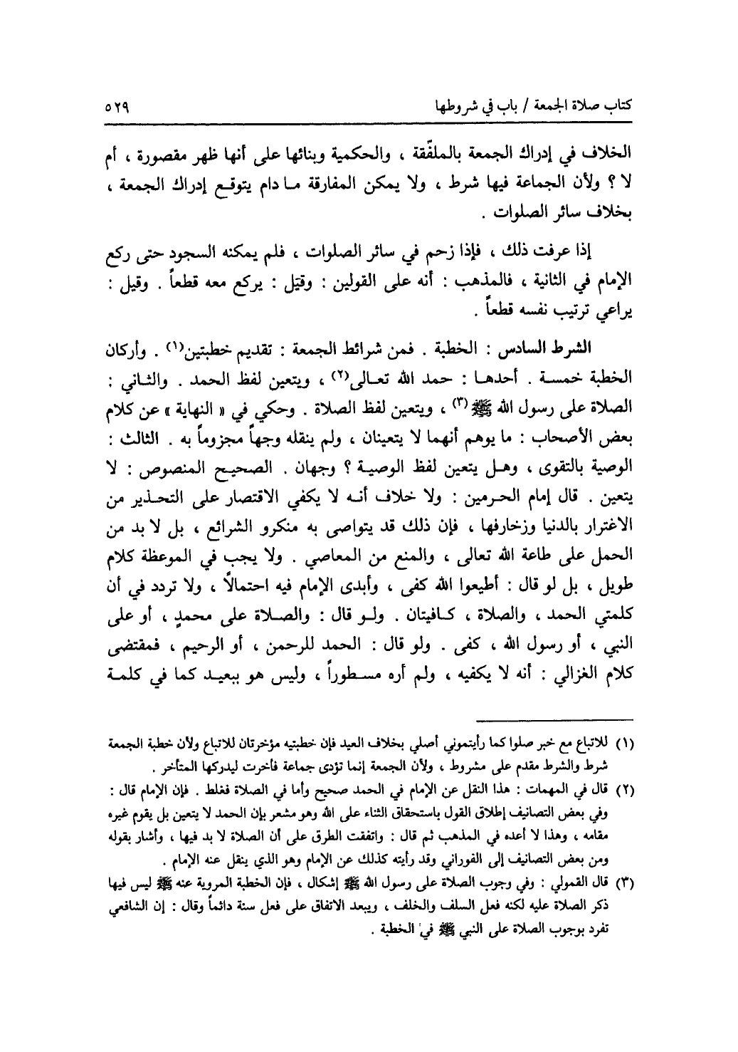 الخلاف في إدراك الجمعة بالملفقة، والحكمية وبنائها على أنها ظهر مقصورة، أم لا ؟ ولان الجماعة فيها شرط، ولا يمكن المفارقة ما دام يتوقع إدراك الجمعة، بخلاف سائر الصلوات. إذا عرفت ذلك، فإذا زحم في سائر الصلوات، فلم يمكنه السجود حتى ركع الامام في الثانية، فالمذهب: أنه على القولين. وقيل: يركع معه قطعا. وقيل: يراعي ترتيب نفسه قطعا. الشرط السادس: الخطبة. فمن شرائط الجمعة: تقديم خطبتين (1). وأركان الخطبة خمسة. أحدها: حمد الله تعالى (2)، ويتعين لفظ الحمد. والثاني: الصلاة على رسول الله - صلى الله عليه وسلم - (3)، ويتعين لفظ الصلاة. وحكي في (النهاية) عن كلام بعض الاصحاب: ما يوهم أنهما لا يتعينان، ولم ينقله وجها مجزوما به. الثالث: الوصية بالتقوى، وهل يتعين لفظ الوصية ؟ وجهان. الصحيح المنصوص: لا يتعين. قال إمام الحرمين: ولا خلاف أنه لا يكفي الاقتصار على التحذير من الاغترار بالدنيا وزخارفها، فإن ذلك قد يتواصى به منكرو الشرائع، بل لا بد من الحمل على طاعة الله تعالى، والمنع من المعاصي. ولا يجب في الموعظة كلام طويل، بل لو قال: أطيعوا الله كفى، وأبدى الامام فيه احتمالا، ولا تردد في أن كلمتي الحمد، والصلاة، كافيتان. ولو قال: والصلاة على محمد، أو على النبي، أو رسول الله، كفى. ولو قال: الحمد للرحمن، أو الرحيم، فمقتضى كلام الغزالي: أنه لا يكفيه، ولم أره مسطورا، وليس هو ببعيد كما في كلمة
