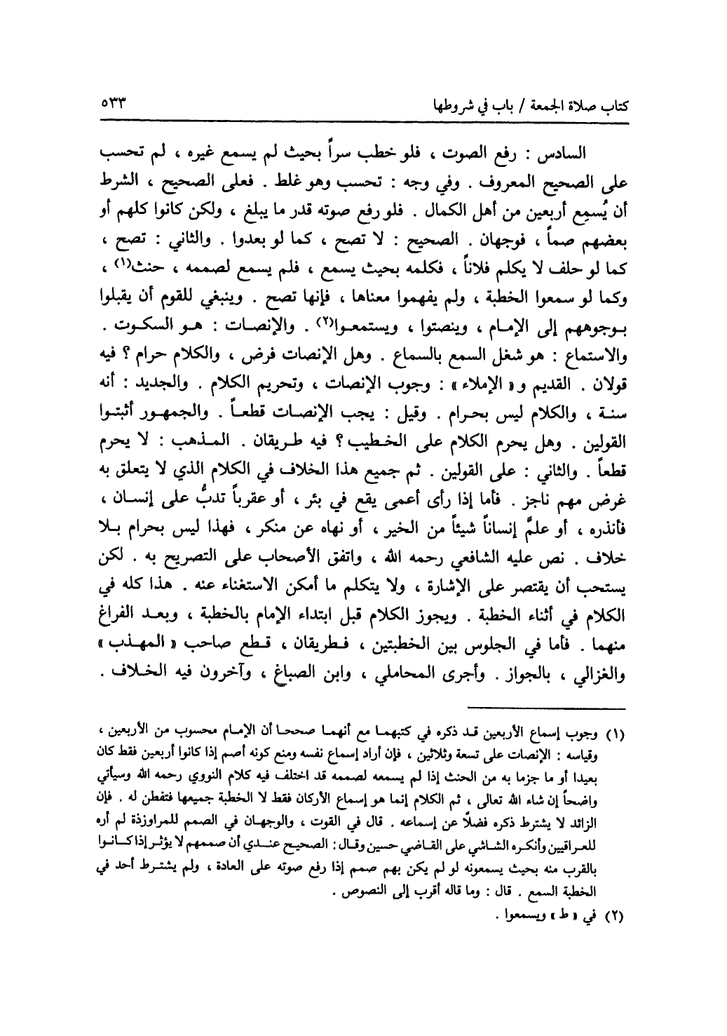 السادس: رفع الصوت، فلو خطب سرا بحيث لم يسمع غيره، لم تحسب على الصحيح المعروف. وفي وجه: تحسب وهو غلط. فعلى الصحيح، الشرط أن يسمع أربعين من أهل الكمال. فلو رفع صوته قدر ما يبلغ، ولكن كانوا كلهم أو بعضهم صما، فوجهان. الصحيح: لا تصح، كما لو بعدوا. والثاني: تصح، كما لو حلف لا يكلم فلانا، فكلمه بحيث يسمع، فلم يسمع لصممه، حنث (1)، وكما لو سمعوا الخطبة، ولم يفهموا معناها، فإنها تصح. وينبغي للقوم أن يقبلوا بوجوههم إلى الامام، وينصتوا، ويسمعوا (2). والانصات: هو السكوت. والاستماع: هو شغل السمع بالسماع. وهل الانصات فرض، والكلام حرام ؟ فيه قولان. القديم و (الاملاء): وجوب الانصات، وتحريم الكلام. والجديد: أنه سنة، والكلام ليس بحرام. وقيل: يجب الانصات قطعا. والجمهور أثبتوا القولين. وهل يحرم الكلام على الخطيب ؟ فيه طريقان. المذهب: لا يحرم قطعا. والثاني: على القولين. ثم جميع هذا الخلاف في الكلام الذي لا يتعلق به غرض مهم ناجز. فأما إذا رأى أعمى يقع في بئر، أو عقربا تدب على إنسان، فأنذره، أو علم إنسانا شيئا من الخير، أو نهاه عن منكر، فهذا ليس بحرام بلا خلاف. نص عليه الشافعي رحمه الله، واتفق الاصحاب على التصريح به. لكن يستحب أن يقتصر على الاشارة، ولا يتكلم ما أمكن الاستغناء عنه. هذا كله في الكلام في أثناء الخطبة. ويجوز الكلام قبل ابتداء الامام بالخطبة، وبعد الفراغ منهما. فأما في الجلوس بين الخطبتين، فطريقان، قطع صاحب (المهذب) والغزالي، بالجواز. وأجرى المحاملي، وابن الصباغ، وآخرون فيه الخلاف.