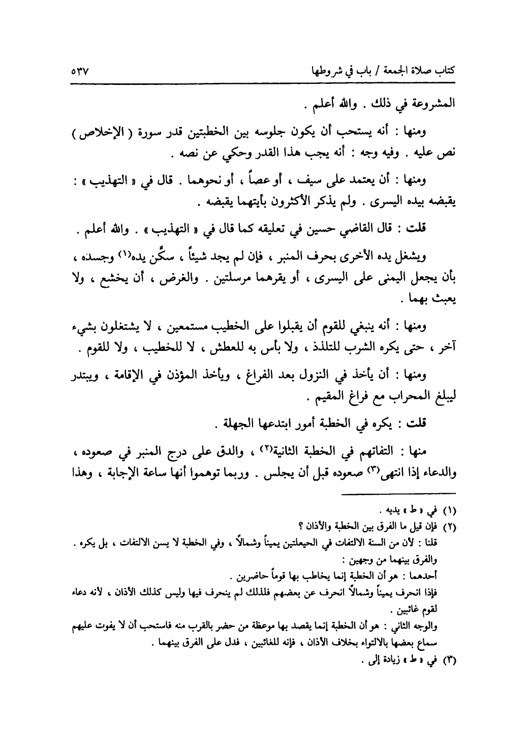 المشروعة في ذلك. والله أعلم. ومنها: أنه يستحب أن يكون جلوسه بين الخطبتين قدر سورة (الاخلاص) نص عليه. وفيه وجه: أنه يجب هذا القدر وحكي عن نصه. ومنها: أن يعتمد على سيف، أو عصا، أو نحوهما. قال في (التهذيب): يقبضه بيده اليسرى. ولم يذكر الاكثرون بأيتهما يقبضه. قلت: قال القاضي حسين في تعليقه كما قال في (التهذيب). والله أعلم. ويشغل يده الاخرى بحرف المنبر، فإن لم يجد شيئا، سكن يده (1) وجسده، بأن يجعل اليمنى على اليسرى، أو يقرهما مرسلتين. والغرض، أن يخشع، ولا يعبث بهما. ومنها: أنه ينبغي للقوم أن يقبلوا على الخطيب مستمعين، لا يشتغلون بشئ آخر، حتى يكره الشرب للتلذذ، ولا بأس به للعطش، لا للخطيب، ولا للقوم. ومنها: أن يأخذ في النزول بعد الفراغ، ويأخذ المؤذن في الاقامة، ويبتدر ليبلغ المحراب مع فراغ المقيم. قلت: يكره في الخطبة أمور ابتدعها الجهلة. منها: التفاتهم في الخطبة الثانية (2)، والدق على درج المنبر في صعوده، والدعاء إذا انتهى (3) إلى صعوده قبل أن يجلس. وربما توهموا أنها ساعة الاجابة، وهذا
