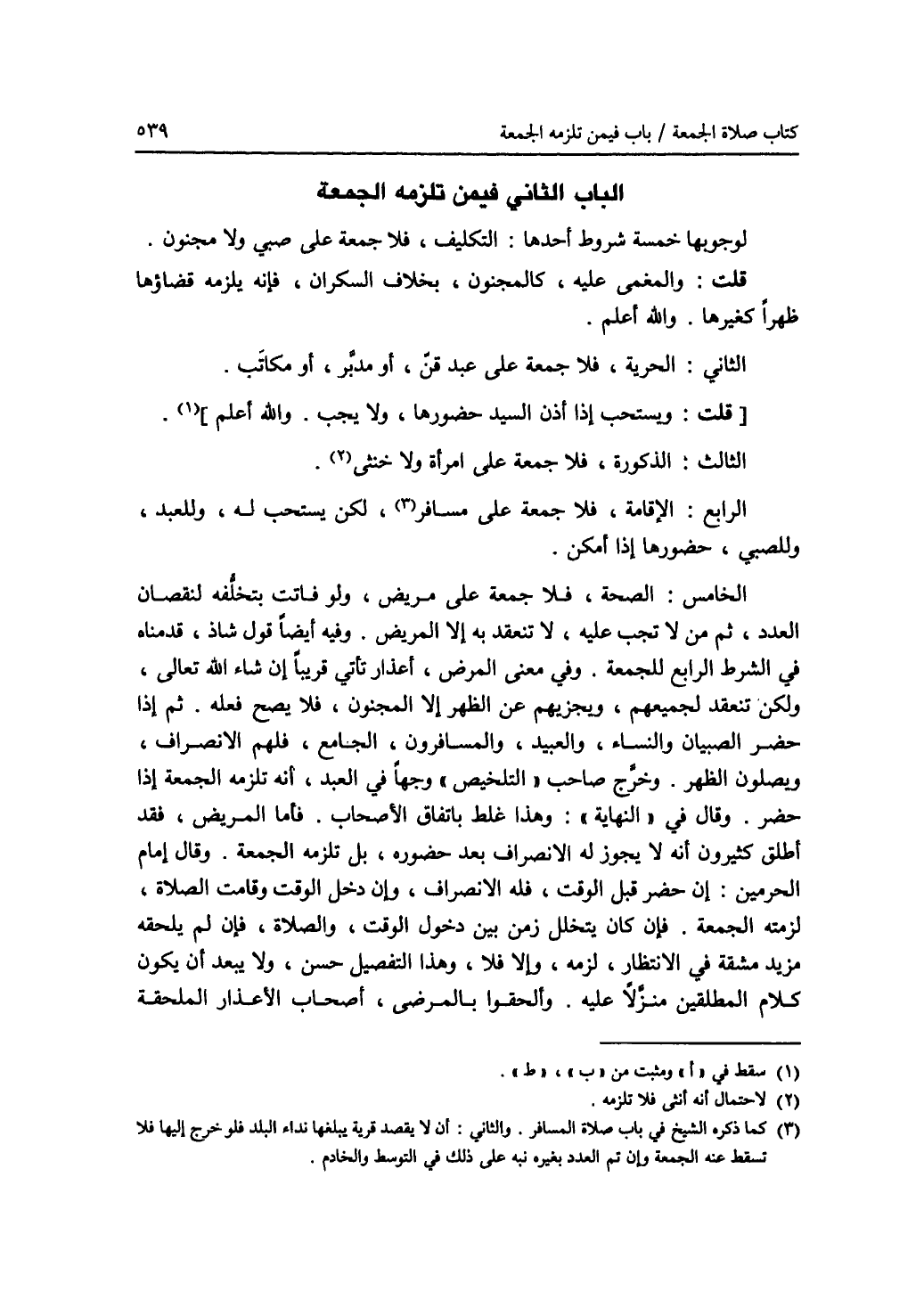 الباب الثاني فيمن تلزمه الجمعة لوجوبها خمسة شروط: أحدها: التكليف، فلا جمعة على صبي ولا مجنون. قلت: والمغمى عليه، كالمجنون، بخلاف السكران، فإنه يلزمه قضاؤها ظهرا كغيرها. والله أعلم. الثاني: الحرية، فلا جمعة على عبد قن، أو مدبر، أو مكاتب. [ قلت: ويستحب إذا أذن السيد حضورها، ولا يجب. والله أعلم ] (1). الثالث: الذكورة، فلا جمعة على امرأة ولا خنثى (2). الرابع: الاقامة، فلا جمعة على مسافر (3)، لكن يستحب له، وللعبد، وللصبي، حضورها إذا أمكن. الخامس: الصحة، فلا جمعة على مريض ولو فاتت بتخلفه لنقصان العدد، ثم من لا تجب عليه، لا تنعقد به إلا المريض. وفيه أيضا قول شاذ، قدمناه في الشرط الرابع للجمعة. وفي معنى المرض، أعذار تأتي قريبا إن شاء الله تعالى، ولكن تنعقد لجميعهم، ويجزيهم عن الظهر إلا المجنون، فلا يصح فعله. ثم إذا حضر الصبيان والنساء، والعبيد، والمسافرون، الجامع، فلهم الانصراف، ويصلون الظهر. وخرج صاحب (التلخيص) وجها في العبد، أنه تلزمه الجمعة إذا حضر. وقال في (النهاية): وهذا غلط باتفاق الاصحاب. فأما المريض، فقد أطلق كثيرون أنه لا يجوز له الانصراف بعد حضوره، بل تلزمه الجمعة. وقال إمام الحرمين: إن حضر قبل الوقت، فله الانصراف، وإن دخل الوقت وقامت الصلاة، لزمته الجمعة. فإن كان يتخلل زمن بين دخول الوقت، والصلاة، فإن لم يلحقه مزيد مشقة في الانتظار، لزمه، وإلا فلا، وهذا التفصيل حسن، ولا يبعد أن يكون كلام المطلقين منزلا عليه. وألحقوا بالمرضى، أصحاب الاعذار الملحقة