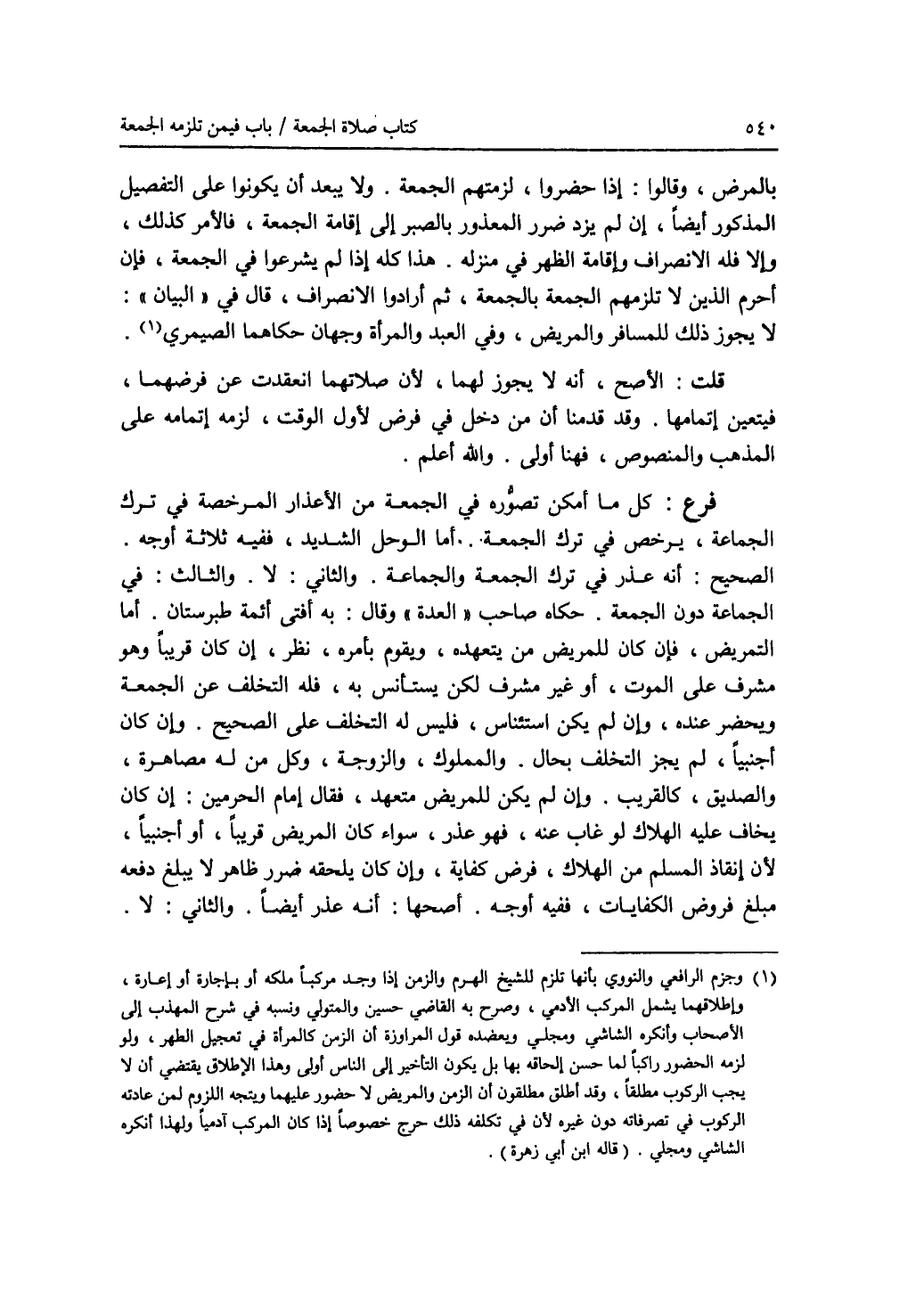 بالمرض، وقالوا: إذا حضروا، لزمتهم الجمعة. ولا يبعد أن يكونوا على التفصيل المذكور أيضا، إن لم يزد ضرر المعذور بالصبر إلى إقامة الجمعة، فالامر كذلك، وإلا فله الانصراف وإقامة الظهر في منزله. هذا كله إذا لم يشرعوا في الجمعة، فإن أحرم الذين لا تلزمهم الجمعة بالجمعة، ثم أرادوا الانصراف، قال في (البيان): لا يجوز ذلك للمسافر والمريض، وفي العبد والمرأة وجهان حكاهما الصيمري (1). قلت: الاصح، أنه لا يجوز لهما، لان صلاتهما انعقدت عن فرضهما، فيتعين إتمامها. وقد قدمنا أن من دخل في فرض لاول الوقت، لزمه إتمامه على المذهب والمنصوص، فهنا أولى. والله أعلم. فرع: كل ما أمكن تصوره في الجمعة من الاعذار المرخصة في ترك الجماعة، يرخص في ترك الجمعة. أما الوحل الشديد، ففيه ثلاثة أوجه. الصحيح: أنه عذر في ترك الجمعة والجماعة. والثاني: لا. والثالث: في الجماعة دون الجمعة. حكاه صاحب (العدة) وقال: به أفتى أئمة طبرستان. أما التمريض، فإن كان للمريض من يتعهده، ويقوم بأمره، نظر، إن كان قريبا وهو مشرف على الموت، أو غير مشرف لكن يستأنس به، فله التخلف عن الجمعة ويحضر عنده، وإن لم يكن استئناس، فليس له التخلف على الصحيح. وإن كان أجنبيا، لم يجز التخلف بحال. والمملوك، والزوجة، وكل من له مصاهرة، والصديق، كالقريب. وإن لم يكن للمريض متعهد، فقال إمام الحرمين: إن كان يخاف عليه الهلاك لو غاب عنه، فهو عذر، سواء كان المريض قريبا، أو أجنبيا، لان انقاذ المسلم من الهلاك، فرض كفاية، وإن كان يلحقه ضرر ظاهر لا يبلغ دفعه مبلغ فروض الكفايات، ففيه أوجه. أصحها: أنه عذر أيضا. والثاني: لا.