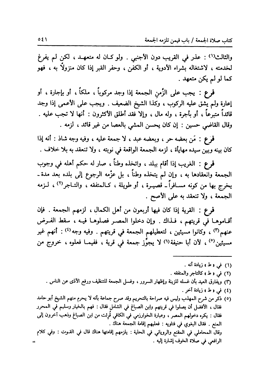 والثالث (1): أنه عذر في القريب دون الاجنبي. ولو كان له متعهد، لكن لم يفرغ لخدمته، لاشتغاله بشراء الادوية، أو الكفن، وحفر القبر إذا كان منزولا به، فهو كما لو لم يكن متعهد. فرع: يجب على الزمن الجمعة إذا وجد مركوبا، ملكا أو بإجارة، أو إعارة ولم يشق عليه الركوب، وكذا الشيخ الضعيف. ويجب على الاعمى إذا وجد قائدا متبرعا، أو بأجرة، وله مال، وإلا فقد أطلق الاكثرون: أنها لا تجب عليه. وقال القاضي حسين: إن كان يحسن المشي بالعصا من غير قائد، لزمه. فرع: من بعضه حر، وبعضه عبد، لا جمعة عليه، وفيه وجه شاذ: أنه إذا كان بينه وبين سيده مهايأة، لزمه الجمعة الواقعة في نوبته، ولا تنعقد به بلا خلاف. فرع: الغريب إذا قام ببلد، واتخذه وطنا، صار له حكم أهله في وجوب الجمعة وانعقادها به، وإن لم يتخذه وطنا، بل عزمه الرجوع إلى بلده بعد مدة - يخرج بها من كونه مسافرا - قصيرة، أو طويلة، كالمتفقه، والتاجر (2) لزمه الجمعة، ولا تنعقد به على الاصح. فرع: القرية إذا كان فيها أربعون من أهل الكمال، لزمهم الجمعة. فإن أقاموها في قريتهم، فذاك. وإن دخلوا المصر فصلوها فيه، سقط الفرض عنهم (3)، وكانوا مسيئين، لتعطيلهم الجمعة في قريتهم. وفيه وجه (4): أنهم غير مسيئين (5)، لان أبا حنيفة (6) لا يجوز جمعة في قرية، ففيما فعلوه، خروج من