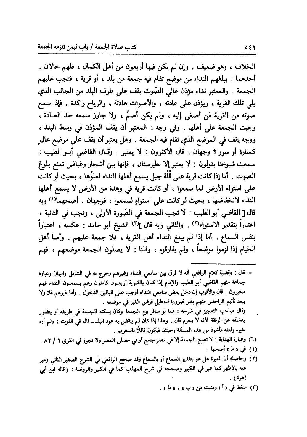 الخلاف، وهو ضعيف. وإن لم يكن فيها أربعون من أهل الكمال، فلهم حالان. أحدهما: يبلغهم النداء من موضع تقام فيه جمعة من بلد، أو قرية، فتجب عليهم الجمعة. والمعتبر نداء مؤذن عالي الصوت يقف على طرف البلد من الجانب الذي يلي تلك القرية، ويؤذن على عادته، والاصوات هادئة، والرياح راكدة. فإذا سمع صوته من القرية من أصغى إليه، ولم يكن أصم، ولا جاوز سمعه حد العادة، وجبت الجمعة على أهلها. وفي وجه: المعتبر أن يقف المؤذن في وسط البلد، ووجه يقف في الموضع الذي تقام فيه الجمعة. وهل يعتبر أن يقف على موضع عال كمنارة أو سور ؟ وجهان. قال الاكثرون: لا يعتبر. وقال القاضي أبو الطيب: سمعت شيوخنا يقولون: لا يعتبر إلا بطبرستان، فإنها بين أشجار وغياض تمنع بلوغ الصوت. أما إذا كانت قرية على قلة جبل يسمع أهلها النداء لعلوها، بحيث لو كانت على استواء الارض لما سمعوا، أو كانت قرية في وهدة من الارض لا يسمع أهلها النداء لانخفاضها، بحيث لو كانت على استواء لسمعوا، فوجهان. أصحهما (1) وبه قال [ القاضي أبو الطيب: لا تجب الجمعة في الصورة الاولى، وتجب في الثانية، اعتبارا بتقدير الاستواء (2). والثاني: وبه قال ] (3) الشيخ أبو حامد: عكسه، اعتبارا بنفس السماع. أما إذا لم يبلغ النداء أهل القرية، فلا جمعة عليهم. وأما أهل الخيام إذا لزموا موضعا، ولم يفارقوه، وقلنا: لا يصلون الجمعة موضعهم، فهم