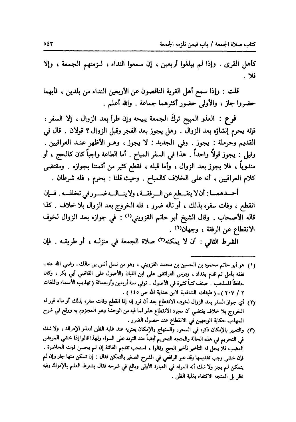 كأهل القرى. وإذ لم يبلغوا أربعين، إن سمعوا النداء، لزمتهم الجمعة، وإلا فلا. قلت: وإذا سمع أهل القرية الناقصون عن الاربعين النداء من بلدين، فأيهما حضروا جاز، والاولى حضور أكثرهما جماعة. والله أعلم. فرع: العذر المبيح ترك الجمعة يبيحه وإن طرأ بعد الزوال، إلا السفر، فإنه يحرم إنشاؤه بعد الزوال. وهل يجوز بعد الفجر وقبل الزوال ؟ قولان. قال في القديم وحرملة: يجوز. وفي الجديد: لا يجوز، وهو الاظهر عند العراقيين. وقيل: يجوز قولا واحدا. هذا في السفر المباح. أما الطاعة واجبا كان كالحج، أو مندوبا، فلا يجوز بعد الزوال، وأما قبله، فقطع كثير من أئمتنا بجوازه. ومقتضى كلام العراقيين، أنه على الخلاف كالمباح. وحيث قلنا: يحرم، فله شرطان. أحدهما: أننا ينقطع عن الرفقة، ولا يناله ضرر في تخلفه للجمعة. فإن انقطع، وفات سفره بذلك، أو ناله ضرر، فله الخروج بعد الزوال بلا خلاف. كذا قاله الاصحاب. وقال الشيخ أبو حاتم القزويني (1): في جوازه بعد الزوال لخوف الانقطاع عن الرفقة، وجهان (2). الشرط الثاني: أن لا يمكنه (3) صلاة الجمعة في منزله، أو طريقه. فإن