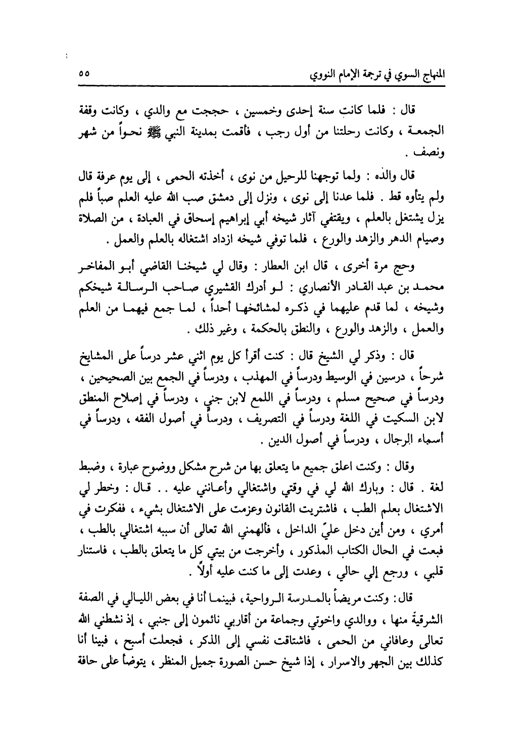 قال: فلما كانت سنة إحدى وخمسين، حججت مع والدي، وكانت وفقة الجمعة، وكانت رحلتنا من أول رجب، فأقمت بمدينة النبي صلى الله عليه وسلم نحو من شهر ونصف. قال والده: ولما توجهنا للرحيل من نوى، أخذته الحمى، إلى يوم عرفة قال ولم يتأوه قط. فلما عدنا إلى نوى، ونزل إلى دمشق صب الله عليه العلم صبا فلم يزل يشتغل بالعلم، ويقتفي آثار أبي إبراهيم إسحاق في العبادة، من الصلاة وصيام الدهر والزهد والورع، فلما توفي شيخه ازاداد اشتغاله بالعلم والعمل. وحج مرة أخرى، قال ابن العطار. وقال لي شيخنا القاضي أبو المفاخر محمد بن عبد القادر الانصاري، لو أدرك القشيري صاحب الرسالة شيخكم وشيخه، لما قدم عليهما في ذكره لمشائخها أحدا، لما جمع فيهما من العلم والعمل، والزهد الورع، والنطق بالحكمة، وغير ذلك. قال: وذكر لي الشيخ قال: كنت أقرأ كل يوم اثني عشر درسا على المشايخ شرحا، درسين في الوسيط ودرسا في المهذب، ودرسا في الجمع بين الصحيحين، ودرسا في صحيح مسلم، ودرسا في اللمع لابن جنى، ودرسا في إصلاح المنطلق لابن السكيت في اللغة ودرسا في التصريف، ودرسا في أصول الفقه، ودرسا في أسماء الرجال، ودرسا في أصول الدين. وقال: وكنت اعلق جميع ما يتعلق بها من شرح مشكل ووضوح، عبارة، وضبط لغة. قال: وبارك الله لي في وقتي واشتغالي وأعانني عليه و.. قال وخطر لي الاشتغال بعلم الطب، فاشتريت القانون وعزمت على الاشتغال بشئ، ففكرت في أمري، ومن أين علي الداخل فألهمني الله تعالى الاشتغال بشئ، ففكرت في أمري، ومن أين دخل على الداخل فالمهني الله تعالى أن سببه اشتغالي بالطب، فبعت في الحال الكتاب المذكور، وأخرجت من بيتي كل ما يتعلق بالطب، فاستنار قلبي، ورجع إلى حالي، وعدت إلى ما كنت عليه أولا. قال: وكنت مريضا بالمدرسة الرواحية، فبينما، أنا في بعض اليالي، في الصفة الشرقية يبمنها، ووالدي واخوتي وجماعة من أقاربي نائمون إلى جنبي، إذ نشطني الله تعالى وعافاني من الحمى، فاشتافت نفسي، إلى الذكر، فجعلت أسبح، فبينا أنا كذلك بين الجهر والاسرار، إذا شيخ حسن الصورة جميل المنظر، يتوضا على حافة