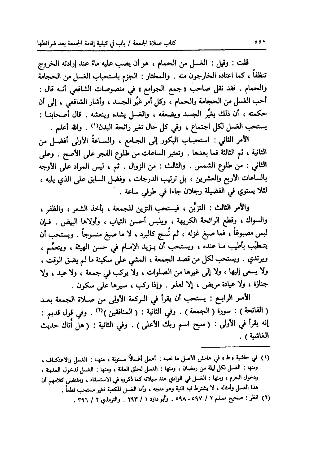 قلت: وقيل: الغسل من الحمام، هو أن يصب عليه ماء عند إرادته الخروج تنظفا، كما اعتاده الخارجون منه. والمختار: الجزم باستحباب الغسل من الحجامة والحمام. فقد نقل صاحب (جمع الجوامع) في منصوصات الشافعي أنه قال: أحب الغسل من الحجامة والحمام، وكل أمر غير الجسد، وأشار الشافعي، إلى أن حكمته، أن ذلك يغير الجسد ويضعفه، والغسل يشده وينعشه. قال أصحابنا: يستحب الغسل لكل اجتماع، وفي كل حال تغير رائحة البدن (1). والله أعلم. الامر الثاني: استحباب البكور إلى الجامع، والساعة الاولى أفضل من الثانية، ثم الثالثة فما بعدها. وتعتبر الساعات من طلوع الفجر على الاصح. وعلى الثاني: من طلوع الشمس. والثالث: من الزوال. ثم، ليس المراد على الاوجه بالساعات الاربع والعشرين، بل ترتيب الدرجات، وفضل السابق على الذي يليه، لئلا يستوي في الفضيلة رجلان جاءا في طرفي ساعة. والامر الثالث: التزين، فيستحب التزين للجمعة، بأخذ الشعر، والظفر، والسواك، وقطع الرائحة الكريهة، ويلبس أحسن الثياب، وأولاها البيض. فإن لبس مصبوغا، فما صبغ غزله، ثم نسج كالبرد، لا ما صبغ منسوجا. ويسحب أن يتطيب بأطيب ما عنده، ويستحب أن يزيد الامام في حسن الهيئة، ويتعمم، ويرتدي. ويستحب لكل من قصد الجمعة، المشي على سكينة ما لم يضق الوقت، ولا يسعى إليها، ولا إلى غيرها من الصلوات، ولا يركب في جمعة، ولا عيد، ولا جنازة، ولا عيادة مريض، إلا لعذر. وإذا ركب، سيرها على سكون. الامر الرابع: يستحب أن يقرأ في الركعة الاولى من صلاة الجمعة بعد (الفاتحة): سورة (الجمعة). وفي الثانية: (المنافقين) (2). وفي قول قديم: إنه يقرأ في الاولى: (سبح اسم ربك الاعلى). وفي الثانية: (هل أتاك حديث الغاشية).