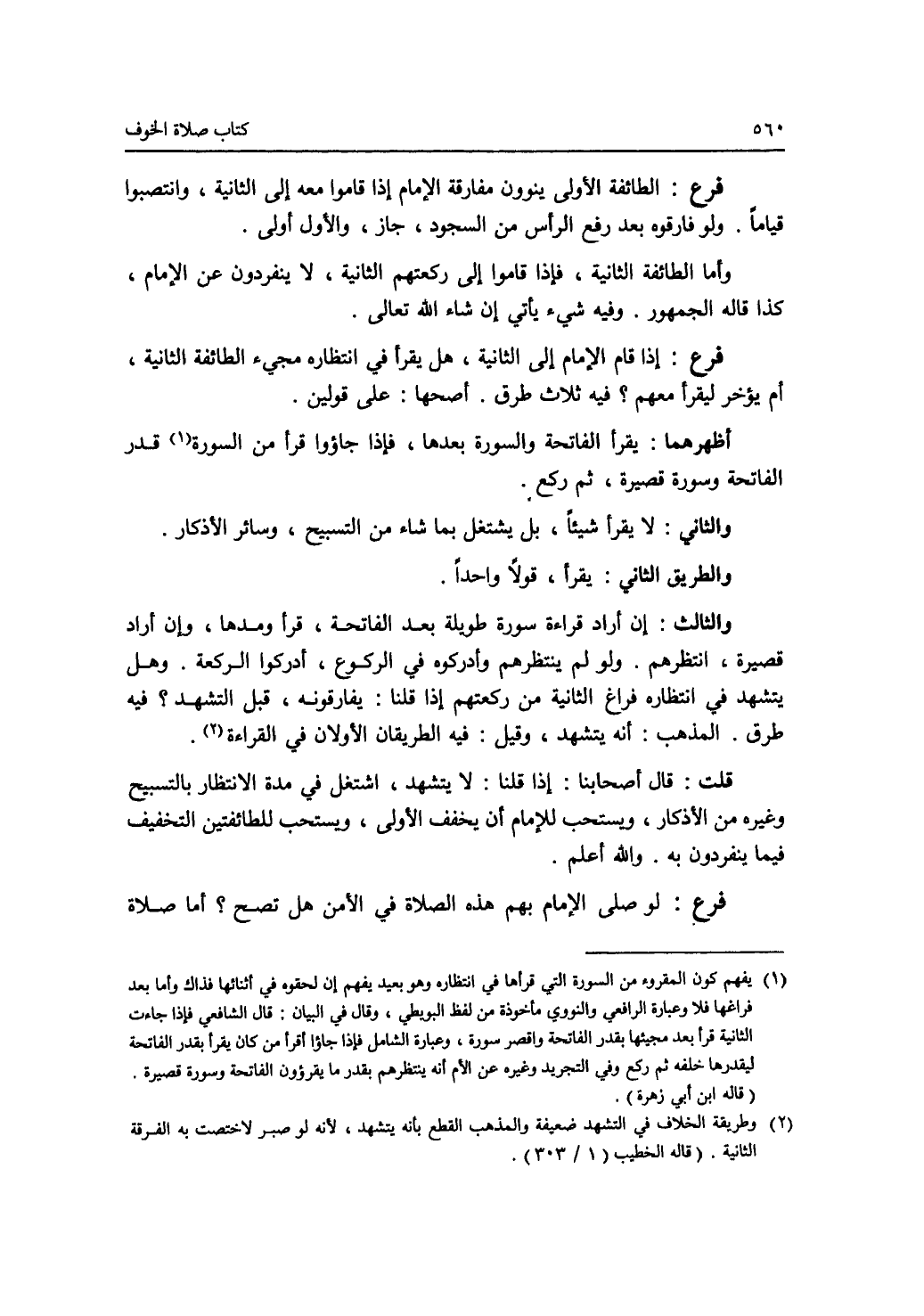 فرع: الطائفة الاولى ينوون مفارقة الامام إذا قاموا معه إلى الثانية، وانتصبوا قياما. ولو فارقوه بعد رفع الرأس من السجود، جاز، والاول أولى. وأما الطائفة الثانية، فإذا قاموا إلى ركعتهم الثانية، لا ينفردون عن الامام، كذا قاله الجمهور. وفيه شئ يأتي إن شاء الله تعالى. فرع: إذا قام الامام إلى الثانية، هل يقرأ في انتظاره مجئ الطائفة الثانية، أم يؤخر ليقرأ معهم ؟ فيه ثلاث طرق. أصحها: على قولين. أظهرهما: يقرأ الفاتحة والسورة بعدها، فإذا جاؤوا قرأ من السورة (1) قدر الفاتحة وسورة قصيرة، ثم ركع. والثاني: لا يقرأ شيئا، بل يشتغل بما شاء من التسبيح، وسائر الاذكار. والطريق الثاني: يقرأ، قولا واحدا. والثالث: إن أراد قراءة سورة طويلة بعد الفاتحة، قرأ ومدها، وإن أراد قصيرة، انتظرهم. ولو لم ينتظرهم وأدركوه في الركوع، أدركوا الركعة. وهل يتشهد في انتظاره فراغ الثانية من ركعتهم إذا قلنا: يفارقونه، قبل التشهد ؟ فيه طرق. المذهب: أنه يتشهد، وقيل: فيه الطريقان الاولان في القراءة (2). قلت: قال أصحابنا: إذا قلنا: لا يتشهد، اشتغل في مدة الانتظار بالتسبيح وغيره من الاذكار، ويستحب للامام أن يخفف الاولى، ويستحب للطائفتين التخفيف فيما ينفردون به. والله أعلم. فرع: لو صلى الامام بهم هذه الصلاة في الامن هل تصح ؟ أما صلاة