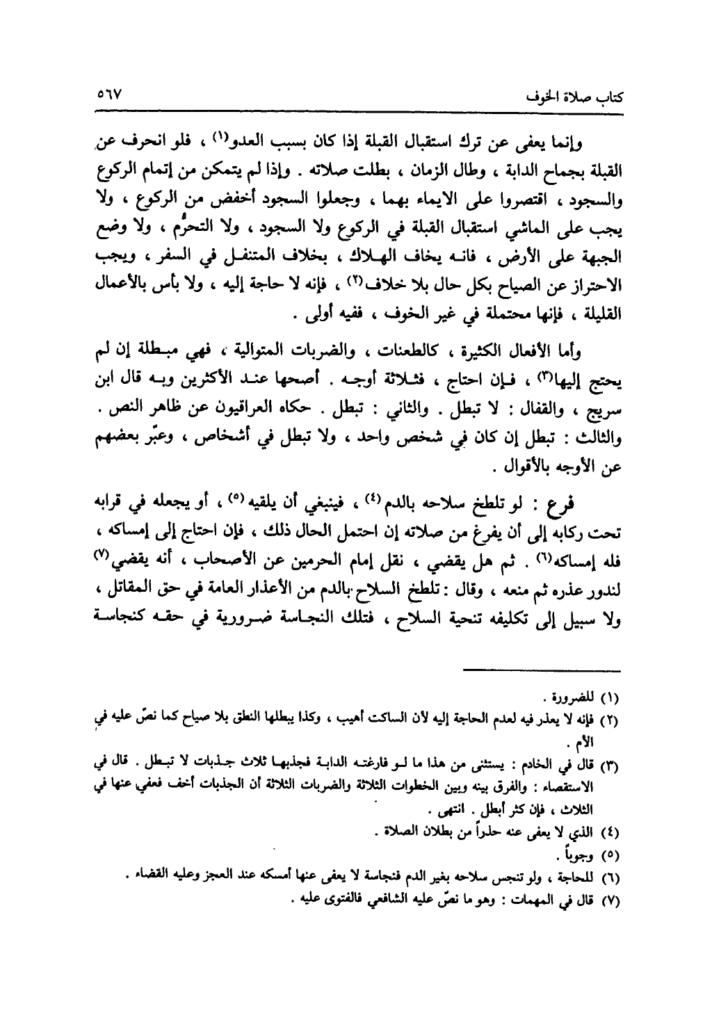 وإنما يعفى عن ترك استقبال القبلة إذا كان بسبب العدو (1)، فلو انحرف عن القبلة بجماح الدابة، وطال الزمان، بطلت صلاته. وإذا لم يتمكن من إتمام الركوع والسجود، اقتصروا على الايماء بهما وجعلوا السجود أخفض من الركوع، ولا يجب على الماشي استقبال القبلة في الركوع ولا السجود، ولا التحرم، ولا وضع الجبهة على الارض، فإنه يخاف الهلاك، بخلاف المتنفل في السفر، ويجب الاحتراز عن الصياح بكل حال بلا خلاف (2)، فإنه لا حاجة إليه، ولا بأس بالاعمال القليلة، فانها محتملة في غير الخوف، ففيه أولى. وأما الافعال الكثيرة، كالطعنات، والضربات المتوالية، فهي مبطلة إن لم يحتج إليها (3)، فإن احتاج، فثلاثة أوجه. أصحها عند الاكثرين وبه قال ابن سريج، والقفال: لا تبطل. والثاني: تبطل. حكاه العراقيون عن ظاهر النص. والثالث: تبطل إن كان في شخص واحد، ولا تبطل في أشخاص، وعبر بعضهم عن الاوجه بالاقوال. فرع: لو تلطخ سلاحه بالدم (4)، فينبغي أن يلقيه (5)، أو يجعله في قرابه تحت ركابه إلى أن يفرغ من صلاته إن احتمل الحال ذلك، فإن احتاج إلى إمساكه، فله إمساكه (6)، ثم هل يقضي نقل إمام الحرمين عن الاصحاب، أنه يقضي (7) لندور عذره ثم منعه، وقال: تلطخ السلاح بالدم من الاعذار العامة في حق المقاتل، ولا سبيل إلى تكليفه تنحية السلاح، فتلك النجاسة ضرورية في حقه كنجاسة