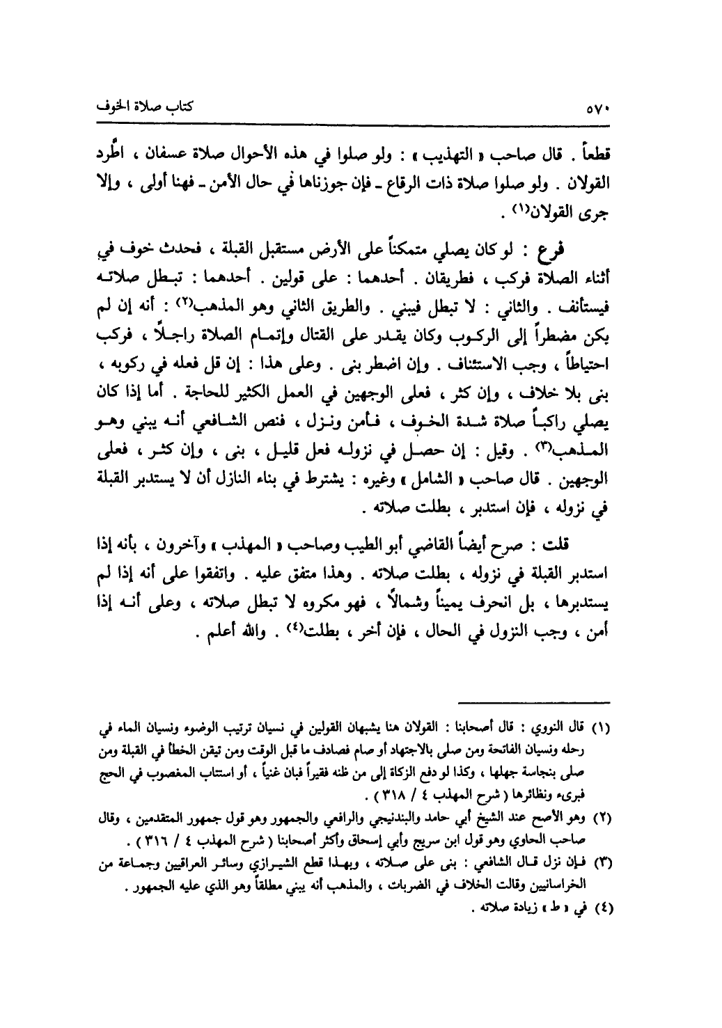 قطعا. قال صاحب (التهذيب): ولو صلوا في هذه الاحوال صلاة عسفان، اطرد القولان. ولو صلوا صلاة ذات الرقاع - فإن جوزناها في حال الامن - فهنا أولى، وإلا جرى القولان (1). فرع: لو كان يصلي متمكنا على الارض مستقبل القبلة، فحدث خوف في أثناء الصلاة فركب، فطريقان. أحدهما: على قولين. أحدهما: تبطل صلاته فيستأنف. والثاني: لا تبطل فيبني. والطريق الثاني وهو المذهب (2): أنه إن لم يكن مضطرا إلى الركوب وكان يقدر على القتال وإتمام الصلاة راجلا، فركب احتياطا، وجب الاستئناف. وإن اضطر بنى. وعلى هذا: إن قل فعله في ركوبه، بنى بلا خلاف، وإن كثر، فعلى الوجهين في العمل الكثير للحاجة. أما إذا كان يصلي راكبا صلاة شدة الخوف، فأمن ونزل، فنص الشافعي أنه يبني وهو المذهب (3). وقيل: إن حصل في نزوله فعل قليل، بنى، وإن كثر، فعلى الوجهين. قال صاحب (الشامل) وغيره: يشترط في بناء النازل أن لا يستدبر القبلة في نزوله، فإن استدبر، بطلت صلاته. قلت: صرح أيضا القاضي أبو الطيب وصاحب (المهذب) وآخرون بأنه إذا استدبر القبلة في نزوله، بطلت صلاته. وهذا متفق عليه. واتفقوا على أنه إذا لم يستدبرها، بل انحرف يمينا وشمالا، فهو مكروه لا تبطل صلاته، وعلى أنه إذا أمن، وجب النزول في الحال، فإن أخر، بطلت (4). والله أعلم.