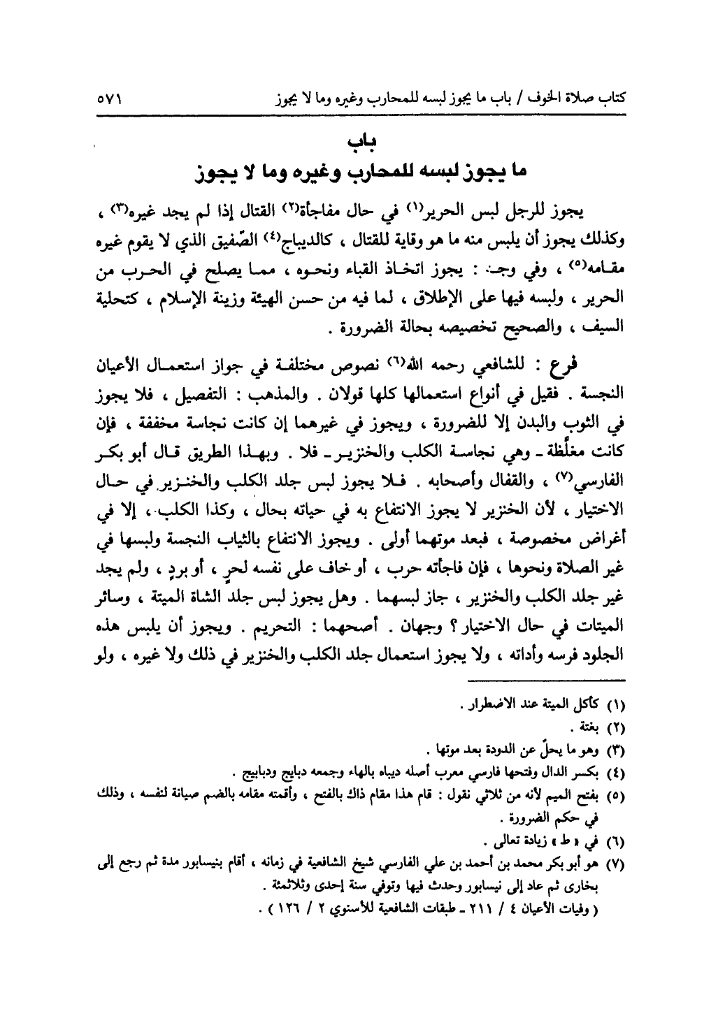 يجوز للرجل لبس الحرير (1) في حال مفاجأة (2) القتال إذا لم يجد غيره (3)، وكذلك يجوز أن يلبس منه ما هو وقاية القتال، كالديباج (4) الصفيق الذي لا يقوم غيره مقامه (5)، وفي وجه: يجوز اتخاذ القباء ونحوه، مما يصلح في الحرب من الحرير، ولبسه فيها على الاطلاق، لما فيه من حسن الهيئة وزينة الاسلام، كتحلية السيف، والصحيح تخصيصه بحالة الضرورة. فرع: للشافعي رحمه الله (6) تعالى نصوص مختلفة في جواز استعمال الاعيان النجسة. فقيل في أنواع استعمالها كلها قولان. والمذهب: التفصيل، فلا يجوز في الثوب والبدن إلا للضرورة، ويجوز في غيرهما إن كانت نجاسة مخففة، فإن كانت مغلظة - وهي نجاسة الكلب والخنزير - فلا. وبهذا الطريق قال أبو بكر الفارسي (7) والقفال وأصحابه. فلا يجوز لبس جلد الكلب والخنزير في حال الاختيار، لان الخنزير لا يجوز الانتفاع به في حياته بحال، وكذا الكلب، إلا في أغراض مخصوصة، فبعد موتهما أولى. ويجوز الانتفاع بالثياب النجسة ولبسها في غير الصلاة ونحوها، فإن فاجأته حرب، أو خاف على نفسه لحر، أو برد، ولم يجد غير جلد الكلب والخنزير، جاز لبسهما. وهل يجوز لبس جلد الشاة الميتة، وسائر الميتات في حال الاختيار ؟ وجهان. أصحهما: التحريم. ويجوز أن يلبس هذه الجلود فرسه وأداته، ولا يجوز استعمال جلد الكلب والخنزير في ذلك ولا غيره، ولو