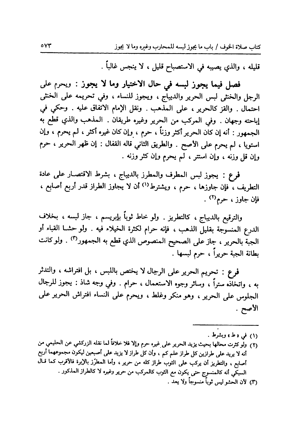 قليله، والذي يصيبه في الاستصباح قليل، لا ينجس غالبا. فصل فيما يجوز لبسه في حال الاختيار وما لا يجوز ؟ ويحرم على الرجل والخنثى لبس الحرير والديباج، ويجوز للنساء. وفي تحريمه على الخنثى احتمال. والقز كالحرير، على المذهب. ونقل الامام الاتفاق عليه. وحكي في إباحته وجهان. وفي المركب من الحرير وغيره طريقان. المذهب والذي قطع به الجمهور: أنه إن كان الحرير أكثر وزنا، حرم، وإن كان غيره أكثر، لم يحرم، وإن استويا، لم يحرم على الاصح. والطريق الثاني قاله القفال: إن ظهر الحرير، حرم وإن قل وزنه، وإن استتر، لم يحرم وإن كثر وزنه. فرع: يجوز لبس المطرف والمطرز بالديباج، بشرط الاقتصار على عادة التطريف، فإن جاوزها، حرم، ويشرط (1) أن لا يجاوز الطراز قدر أربع أصابع، فإن جاوز، حرم (2). الترقيع بالديباج، كالتطريز. ولو خاط ثوبا بإبريسم، جاز لبسه، بخلاف الدرع المنسوجة بقليل الذهب، فإنه حرام لكثرة الخيلاء فيه. ولو حشا القباء أو الجبة بالحرير، جاز على الصحيح المنصوص الذي قطع به الجمهور (3). ولو كانت بطانة الجبة حريرا، حرم لبسها. فرع: تحريم الحرير على الرجال لا يختص باللبس، بل افتراشه، والتدثر به، واتخاذه سترا، وسائر وجوه الاستعمال، حرام. وفي وجه شاذ: يجوز للرجال الجلوس على الحرير، وهو منكر وغلط، ويحرم على النساء افتراش الحرير على الاصح.