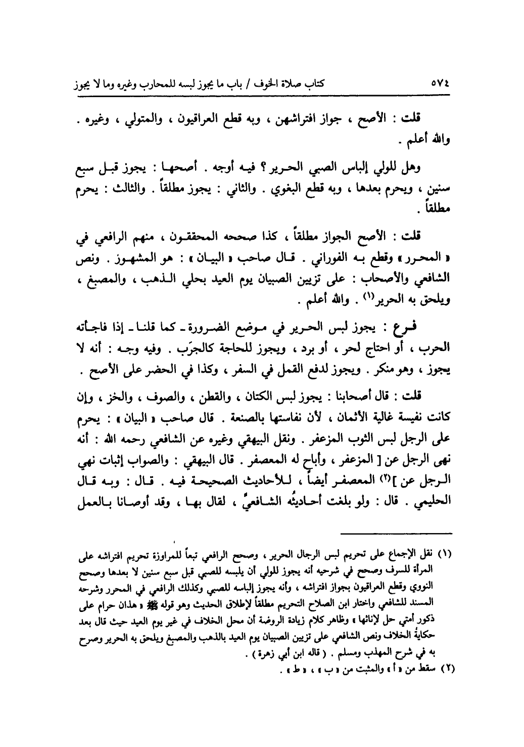 قلت: الاصح، جواز افتراشهن، وبه قطع العراقيون، والمتولي، وغيره. والله أعلم. وهل للولي إلباس الصبي الحرير ؟ فيه أوجه. أصحها: يجوز قبل سبع سنين، ويحرم بعدها، وبه قطع البغوي. والثاني: يجوز مطلقا. والثالث: يحرم مطلقا. قلت: الاصح الجواز مطلقا، كذا صححه المحققون، منهم الرافعي في (المحرر) وقطع به الفوراني. قال صاحب (البيان): هو المشهور. ونص الشافعي والاصحاب: على تزيين الصبيان يوم العيد بحلي الذهب، والمصبغ، ويلحق به الحرير (1). والله أعلم. فرع: يجوز لبس الحرير في موضع الضرورة - كما قلنا - إذا فاجأته الحرب، أو احتاج لحر، أو برد، ويجوز للحاجة كالجرب. وفيه وجه: أنه لا يجوز، وهو منكر. ويجوز لدفع القمل في السفر، وكذا في الحضر على الاصح. قلت: قال أصحابنا: يجوز لبس الكتان، والقطن، والصوف، والخز، وإن كانت نفيسة غالية الاثمان، لان نفاستها بالصنعة. قال صاحب (البيان): يحرم على الرجل لبس الثوب المزعفر. ونقل البيهقي وغيره عن الشافعي رحمه الله: أنه نهى الرجل عن [ المزعفر، وأباح له المعصفر. قال البيهقي: والصواب إثبات نهي الرجل عن ] (2) المعصفر أيضا، للاحاديث الصحيحة فيه. قال: وبه قال الحليمي. قال: ولو بلغت أحاديثه الشافعي، لقال بها، وقد أوصانا بالعمل