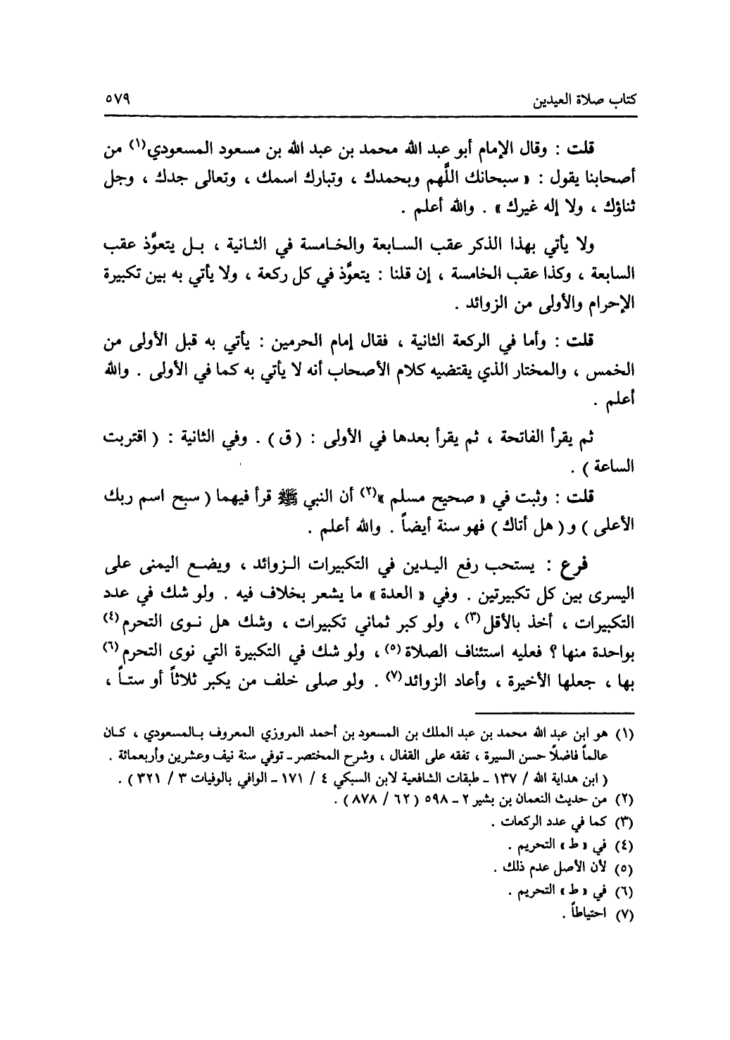قلت: وقال الامام أبو عبد الله محمد بن عبد الله بن مسعود المسعودي (1) من أصحابنا يقول: (سبحانك اللهم وبحمدك، وتبارك اسمك، وتعالى جدك، وجل ثناؤك، ولا إله غيرك). والله أعلم. ولا يأتي بهذا الذكر عقب السابعة والخامسة في الثانية، بل يتعوذ عقب السابعة، وكذا عقب الخامسة، إن قلنا: يتعوذ في كل ركعة، ولا يأتي به بين تكبيرة الاحرام والاولى من الزوائد. قلت: وأما في الركعة الثانية، فقال إمام الحرمين: يأتي به قبل الاولى من الخمس، والمختار الذي يقتضيه كلام الاصحاب أنه لا يأتي به كما في الاولى. والله أعلم. ثم يقرأ الفاتحة، ثم يقرأ بعدها في الاولى: (ق). وفي الثانية: (اقتربت الساعة). قلت: وثبت في (صحيح مسلم) (2) أن النبي - صلى الله عليه وسلم - قرأ فيهما (سبح اسم ربك الاعلى) و (وهل أتاك) فهو سنة أيضا. والله أعلم. فرع: يستحب رفع اليدين في التكبيرات الزوائد، ويضع اليمنى على اليسرى بين كل تكبيرتين. وفي (العدة) ما يشعر بخلاف فيه. ولو شك في عدد التكبيرات، أخذ بالاقل (3)، ولو كبر ثماني تكبيرات، وشك هل نوى التحريم (4) بواحدة منها ؟ فعليه استئناف الصلاة (5)، ولو شك في التكبيرة التي نوى التحريم (6) بها، جعلها الاخيرة، وأعاد الزوائد (7). ولو صلى خلف من يكبر ثلاثا أو ستا،
