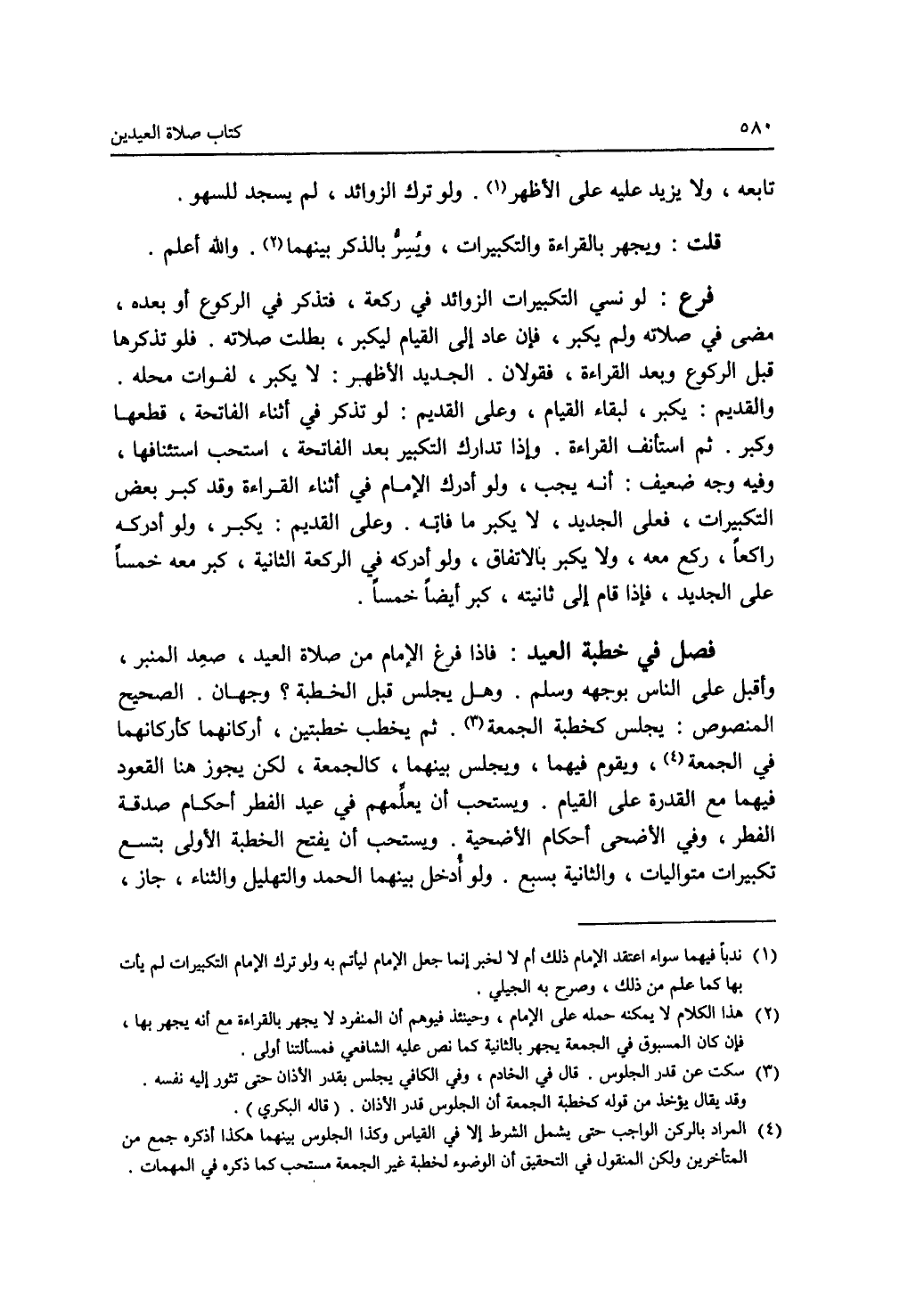 فصل في خطبة العيد : فإذا فرغ الامام من صلاة العيد، صعد المنبر، وأقبل على الناس بوجهه وسلم. وهل يجلس قبل الخطبة ؟ وجهان. الصحيح المنصوص: يجلس كخطبة الجمعة (3). ثم يخطب خطبتين، أركانهما كأركانهما في الجمعة (4)، ويقوم فيهما، ويجلس بينهما، كالجمعة، لكن يجوز هنا القعود فيهما مع القدرة على القيام. ويستحب أن يعلمهم في عيد الفطر أحكام صدقة الفطر، وفي الاضحى أحكام الاضحية. ويستحب أن يفتح الخطبة الاولى بتسع تكبيرات متواليات، والثانية بسبع. ولو أدخل بينهما الحمد والتهليل والثناء، جاز،