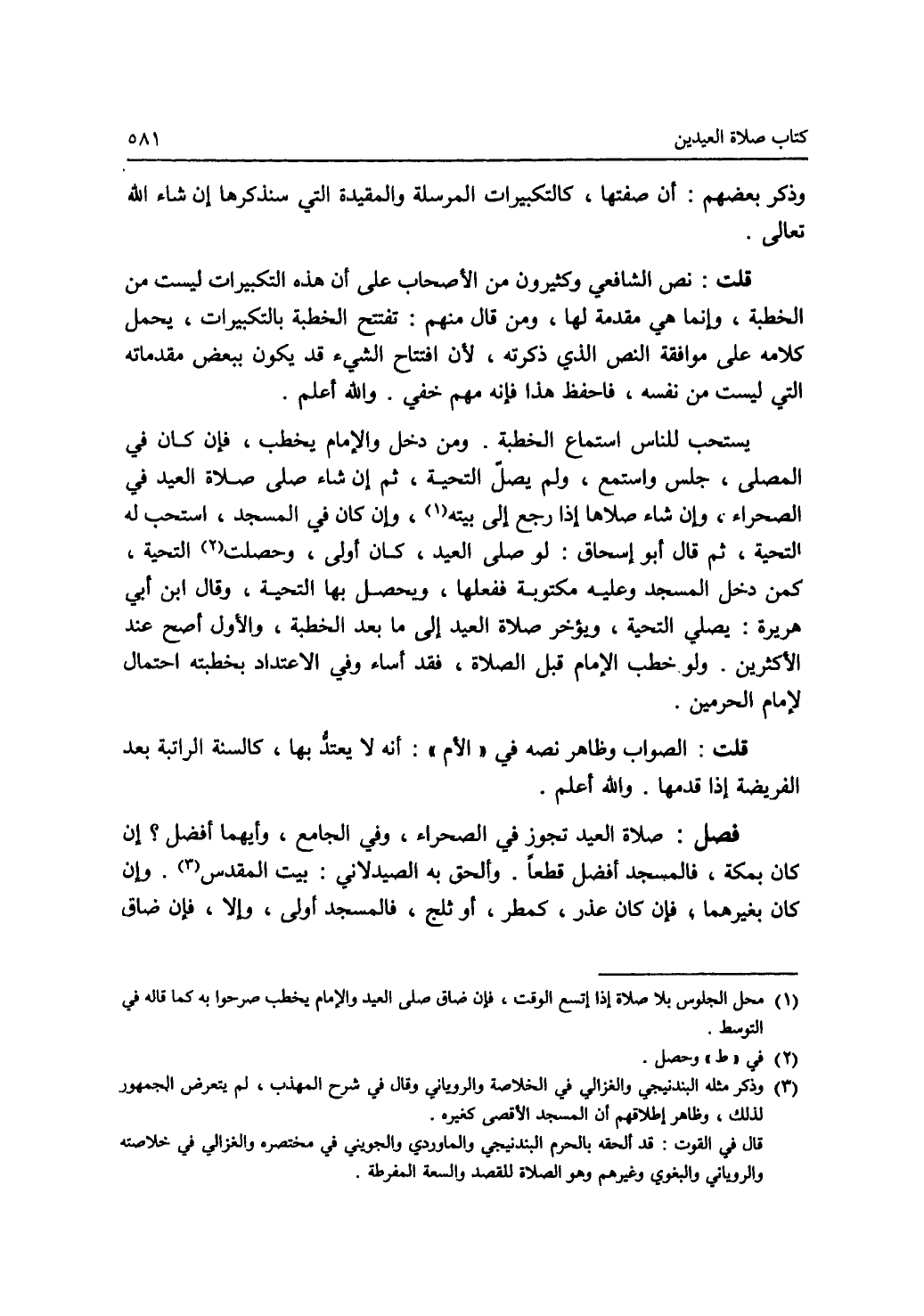 فصل: صلاة العيد تجوز في الصحراء، وفي الجامع، وأيهما أفضل ؟ إن كان بمكة، فالمسجد أفضل قطعا. وألحق به الصيدلاني: بيت المقدس (3). وإن كان بغيرهما، فإن كان عذر، كمطر، أو ثلج، فالمسجد أولى، وإلا، فإن ضاق