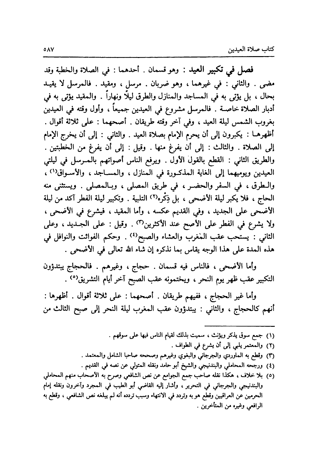 فصل في تكبير العيد : وهو قسمان. أحدهما: في الصلاة والخطبة وقد مضى. والثاني: في غيرهما، وهو ضربان. مرسل، ومقيد. فالمرسل لا يقيد بحال، بل يؤتى به في المساجد والمنازل والطرق ليلا ونهارا. والمقيد يؤتى به في أدبار الصلاة خاصة. فالمرسل مشروع في العيدين جميعا، وأول وقته في العيدين بغروب الشمس ليلة العيد، وفي آخر وقته طريقان. أصحهما: على ثلاثة أقوال. أظهرها: يكبرون إلى أن يحرم الامام بصلاة العيد. والثاني: إلى أن يخرج الامام إلى الصلاة. والثالث: إلى أن يفرغ منها. وقيل: إلى أن يفرغ من الخطبتين. والطريق الثاني: القطع بالقول الاول. ويرفع الناس أصواتهم بالمرسل في ليلتي العيدين ويوميهما إلى الغاية المذكورة في المنازل، والمساجد، والاسواق (1)، والطرق، في السفر والحضر، في طريق المصلى، وبالمصلى. ويستثنى منه الحاج، فلا يكبر ليلة الاضحى، بل ذكره (2) التلبية. وتكبير ليلة الفطر آكد من ليلة الاضحى على الجديد، وفي القديم عكسه، وأما المقيد، فيشرع في الاضحى، ولا يشرع في الفطر على الاصح عند الاكثرين (3). وقيل: على الجديد، وعلى الثاني: يستحب عقب المغرب والعشاء والصبح (4). وحكم الفوائت والنوافل في هذه المدة على هذا الوجه يقاس بما نذكره إن شاء الله تعالى في الاضحى. وأما الاضحى، فالناس فيه قسمان. حجاج، وغيرهم. فالحجاج يبتدؤون التكبير عقب ظهر يوم النحر، ويختمونه عقب الصبح آخر أيام التشريق (5). وأما غير الحجاج، ففيهم طريقان. أصحهما: على ثلاثة أقوال. أظهرها: أنهم كالحجاج. والثاني: يبتدؤون عقب المغرب ليلة النحر إلى صبح الثالث من