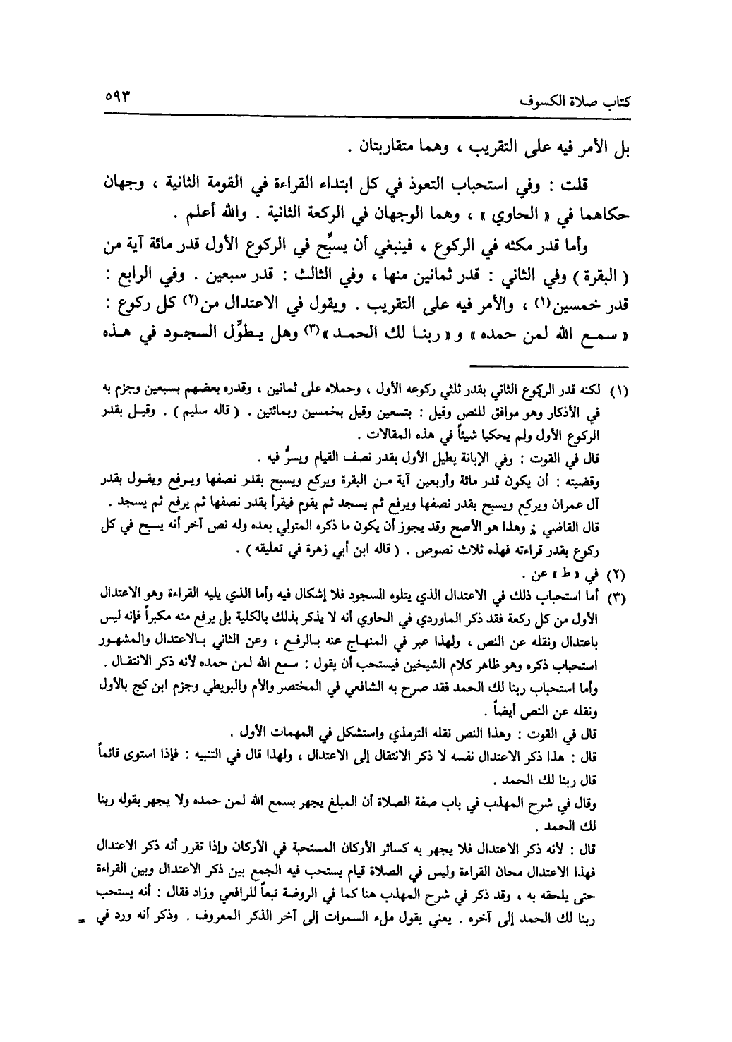 بل الامر فيه على التقريب، وهما متقاربتان. قلت: وفي استحباب التعوذ في ابتداء القراءة في القومة الثانية، وجهان حكاهما في (الحاوي)، وهما الوجهان في الركعة الثانية. والله أعلم. وأما قدر مكثه في الركوع، فينبغي أن يسبح في الركوع الاول قدر مائة آية من (البقرة) وفي الثاني: قدر ثمانين منها، وفي الثالث: قدر سبعين. وفي الرابع: قدر خمسين (1)، والامر فيه على التقريب. ويقول في الاعتدال من (2) كل ركوع: (سمع الله لمن حمده) و (ربنا لك الحمد) (3) وهل يطول السجود في هذه