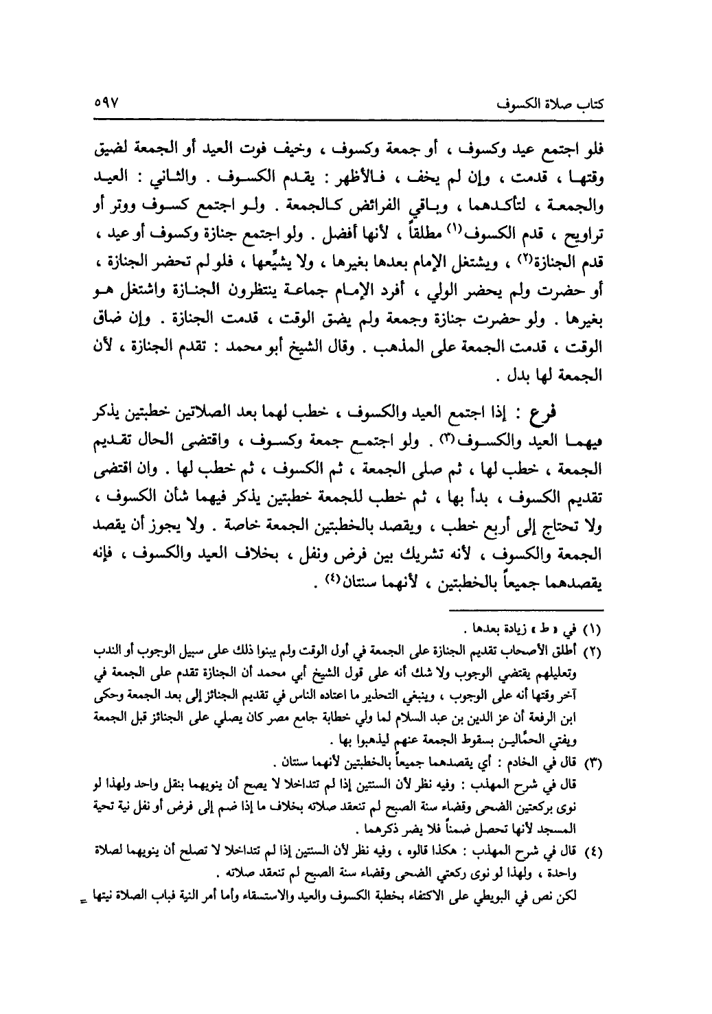 فلو اجتمع عيد وكسوف، أو جمعة وكسوف، وخيف فوت العيد أو الجمعة لضيق وقتها، قدمت، وإن لم يخف، فالاظهر: يقدم الكسوف. والثاني: العيد والجمعة، لتأكدهما، وباقي الفرائض كالجمعة. ولو اجتمع كسوف ووتر أو تراويح، قدم الكسوف (1) مطلقا، لانها أفضل. ولو اجتمع جنازة وكسوف أو عيد، قدم الجنازة (2)، ويشتغل الامام بعدها بغيرها، ولا يشيعها، فلو لم تحضر الجنازة، أو حضرت ولم يحضر الولي، أفرد الامام جماعة ينتظرون الجنازة واشتغل هو بغيرها. ولو حضرت جنازة وجمعة ولم يضق الوقت، قدمت الجنازة. وإن ضاق الوقت، قدمت الجمعة على المذهب. وقال الشيخ أبو محمد: تقدم الجنازة، لان الجمعة لها بدل. فرع: إذا اجتمع العيد والكسوف، خطب لهما بعد الصلاتين خطبتين يذكر فيهما العيد والكسوف (3). ولو اجتمع جمعة وكسوف، واقتضى الحال تقديم الجمعة، خطب لها، ثم صلى الجمعة، ثم الكسوف، ثم خطب لها. وإن اقتضى تقديم الكسوف، بدأ بها، ثم خطب للجمعة خطبتين يذكر فيهما شأن الكسوف، ولا تحتاج إلى أربع خطب، ويقصد بالخطبتين الجمعة خاصة. ولا يجوز أن يقصد الجمعة والكسوف، لانه تشريك بين فرض ونفل، بخلاف العيد والكسوف، فإنه يقصدهما جميعا بالخطبتين، لانهما سنتان (4).
