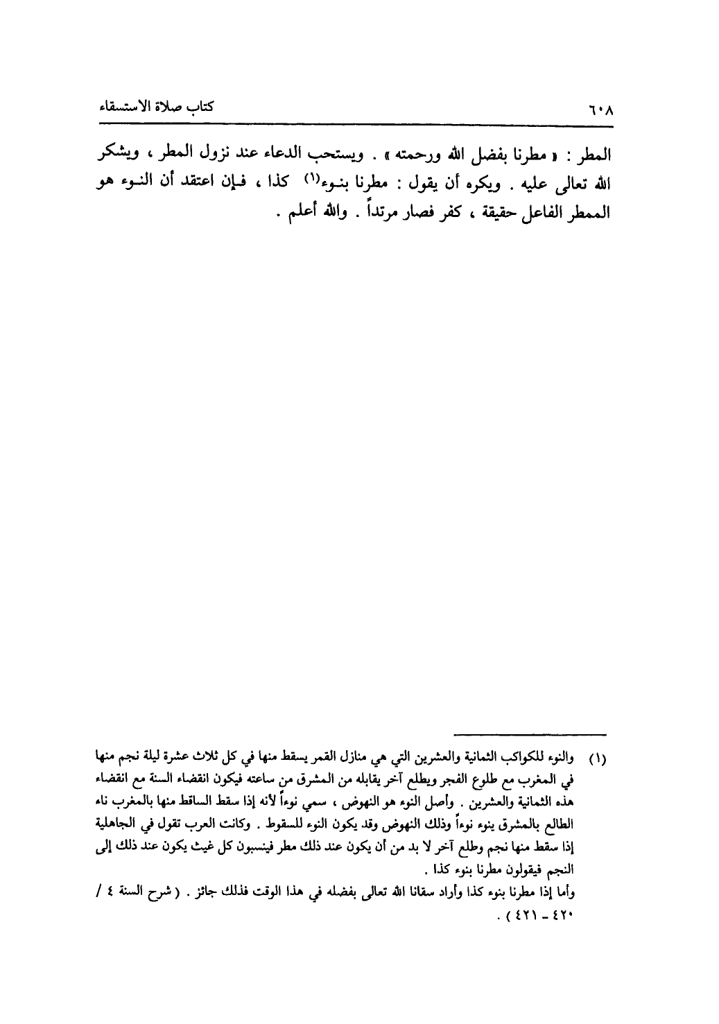 المطر: (مطرنا بفضل الله ورحمته). ويستحب الدعاء عند نزول المطر، ويشكر الله تعالى عليه. ويكره أن يقول: مطرنا بنوء (1) كذا، فإن اعتقد أن النوء هو الممطر الفاعل حقيقة، كفر فصار مرتدا. والله أعلم.