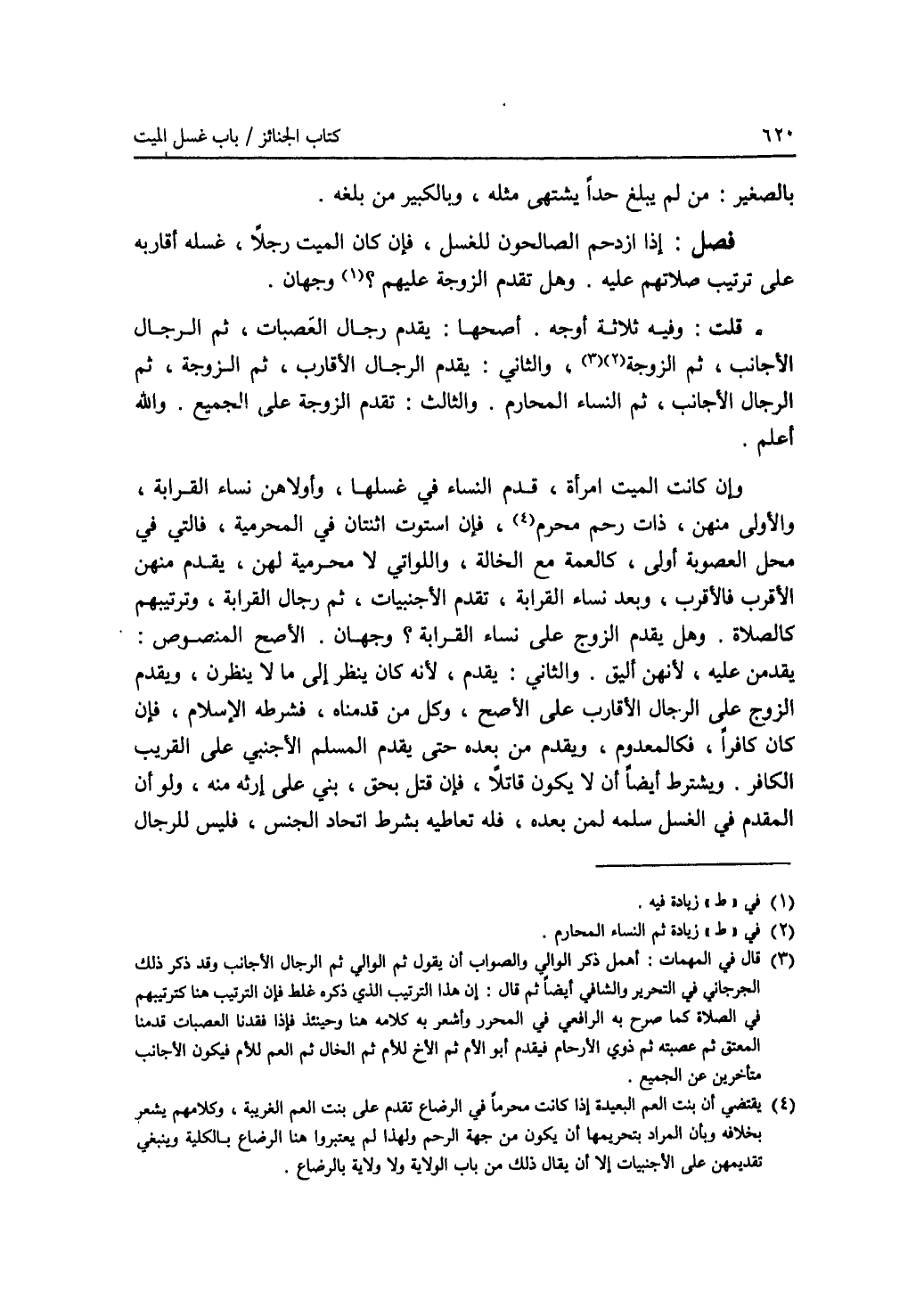 بالصغير: من لم يبلغ حدا يشتهى مثله، وبالكبير من بلغه. فصل: إذا ازدحم الصالحون للغسل، فإن كان الميت رجلا، غسله أقاربه على ترتيب صلاتهم عليه. وهل تقدم الزوجة عليهم ؟ (1) وجهان. قلت: وفيه ثلاثة أوجه. أصحها: يقدم رجال العصبات، ثم الرجال الاجانب، ثم الزوجة (2) (3)، والثاني: يقدم الرجال الاقارب، ثم الزوجة، ثم الرجال الاجانب، ثم النساء المحارم. والثالث: تقدم الزوجة على الجميع. والله أعلم. وإن كان الميت امرأة، قدم النساء في غسلها، وأولاهن نساء القرابة، والاولى منهن، ذات رحم محرم (4)، فإن استوت اثنتان في المحرمية، فالتي في محل العصوبة أولى، كالعمة مع الخالة، واللواتي لا محرمية لهن، يقدم منهن الاقرب فالاقرب، وبعد نساء القرابة، تقدم الاجنبيات، ثم رجال القرابة، وترتيبهم كالصلاة. وهل يقدم الزوج على نساء القرابة ؟ وجهان. الاصح المنصوص: يقدمن عليه، لانهن أليق. والثاني: يقدم، لانه كان ينظر إلى ما لا ينظرن، ويقدم الزوج على الرجال الاقارب على الاصح، وكل من قدمناه، فشرطه الاسلام، فإن كان كافرا، فكالمعدوم، ويقدم من بعده حتى يقدم المسلم الاجنبي على القريب الكافر. ويشترط أيضا أن لا يكون قاتلا، فإن قتل بحق، بني على إرثه منه، ولو أن المقدم في الغسل سلمه لمن بعده، فله تعاطيه بشرط اتحاد الجنس، فليس للرجال