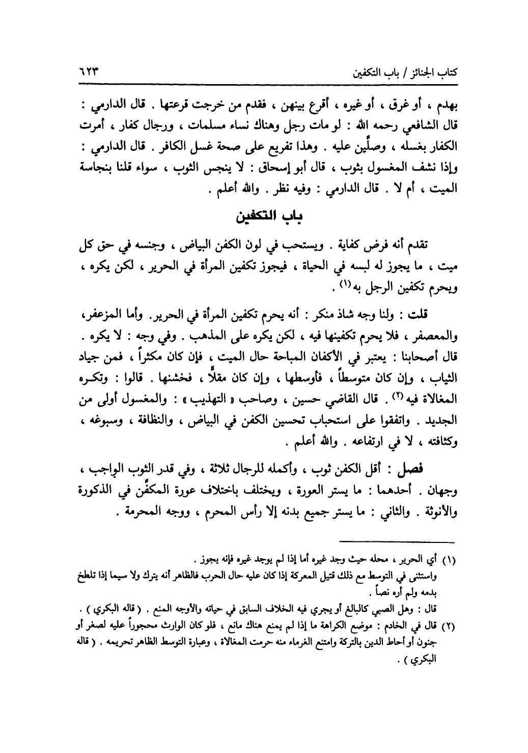 تقدم أنه فرض كفاية. ويستحب في لون الكفن البياض، وجنسه في حق كل ميت، ما يجوز له لبسه في الحياة، فيجوز تكفين المرأة في الحرير، لكن يكره، ويحرم تكفين الرجل به (1). قلت: ولنا وجه شاذ منكر: أنه يحرم تكفين المرأة في الحرير. وأما المزعفر، والمعصفر، فلا يحرم تكفينها فيه، لكن يكره على المذهب. وفي وجه: لا يكره. قال أصحابنا: يعتبر في الاكفان المباحة حال الميت، فإن كان مكثرا، فمن جياد الثياب، وإن كان متوسطا، فأوسطها، وإن كان مقلا، فخشنها. قالوا: وتكره المغالاة فيه (2). قال القاضي حسين، وصاحب (التهذيب): والمغسول أولى من الجديد. واتفقوا على استحباب تحسين الكفن في البياض، والنظافة، وسبوغه، وكثافته، لا في ارتفاعه. والله أعلم. فصل: أقل الكفن ثوب، وأكمله للرجال ثلاثة، وفي قدر الثوب الواجب، وجهان. أحدهما: ما يستر العورة، ويختلف باختلاف عورة المكفن في الذكورة والانوثة. والثاني: ما يستر جميع بدنه إلا رأس المحرم، ووجه المحرمة.