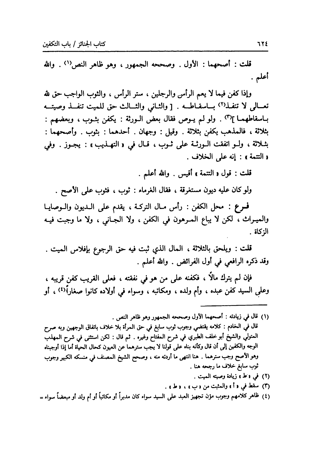 قلت: أصحهما: الاول. وصححه الجمهور، وهو ظاهر النص (1). والله أعلم. وإذا كفن فيما لا يعم الرأس والرجلين، ستر الرأس. والثوب الواجب حق لله تعالى لا تنفذ (2) وصية الميت بإسقاطه. [ والثاني والثالث حق للميت تنفذ وصيته بإسقاطهما ] (3). ولو لم يوص فقال بعض الورثة: يكفن بثوب، وبعضهم: بثلاثة، فالمذهب يكفن بثلاثة. وقيل: وجهان. أحدهما: بثوب. وأصحهما: بثلاثة، ولو اتفقت الورثة على ثوب، قال في (التهذيب): يجوز. وفي (التتمة): انه على الخلاف. قلت: قول (التتمة) أقيس. والله أعلم. ولو كان عليه ديون مستغرقة، فقال الغرماء: ثوب، فثوب على الاصح. فرع: محل الكفن: رأس مال التركة، يقدم على الديون والوصايا والميراث، لكن لا يباع المرهون في الكفن، ولا الجاني، ولا ما وجبت فيه الزكاة. قلت: ويلحق بالثلاثة، المال الذي ثبت فيه حق الرجوع بإفلاس الميت. وقد ذكره الرافعي في أول الفرائض. والله أعلم. فإن لم يترك مالا، فكفنه على من هو في نفقته، فعلى القريب كفن قريبه، وعلى السيد كفن عبده، وأم ولده، ومكاتبه، وسواء في أولاده كانوا صغارا (4)، أو