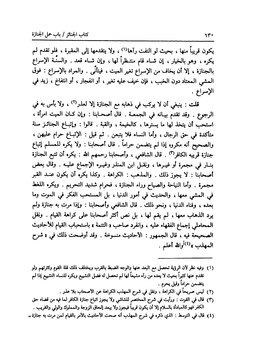 يكون قريبا منها، بحيث لو التفت رآها (1)، ولا يتقدمها إلى المقبرة، فلو تقدم لم يكره، وهو بالخيار، إن شاء قام منتظرا لها، وإن شاء قعد. والسنة الاسراع بالجنازة، إلا أن يخاف من الاسراع تغير الميت، فيتأنى. والمراد بالاسراع: فوق المشي المعتاد دون الخبب، فإن خيف عليه تغير، أو انفجار، أو انتفاخ، زيد في الاسراع. قلت: ينبغي أن لا يركب في ذهابه مع الجنازة إلا لعذر (2)، ولا بأس به في الرجوع. وقد تقدم بيانه في الجمعة. قال أصحابنا: وإن كان الميت امرأة، استحب أن يتخذ لها ما يسترها، كالخيمة، والقبة. قالوا: وإتباع الجنائز سنة متأكدة في حق الرجال، وأما النساء فلا يتبعن. ثم قيل: الاتباع حرام عليهن، والصحيح أنه مكروه إذا لم يتضمن حراما. قال أصحابنا: ولا يكره للمسلم اتباع جنازة قريبه الكافر (3). قال الشافعي، وأصحابنا رحمهم الله: يكره أن تتبع الجنازة بنار في مجمرة أو غيرها، ونقل ابن المنذر وغيره الاجماع عليه. وقال بعض أصحابنا: لا يجوز ذلك. والمذهب: الكراهة. وكذا يكره أن يكون عند القبر مجمرة. وأما النياحة والصياح وراء الجنازة، فحرام شديد التحريم. ويكره اللغط في المشي معها، والحديث في أمور الدنيا، بل المستحب الفكر في الموت وما بعده، وفناء الدنيا، ونحو ذلك. قال الشافعي وأصحابنا: وإذا مرت به جنازة ولم يرد الذهاب معها، لم يقم لها، بل نص أكثر أصحابنا على كراهة القيام. ونقل المحاملي إجماع الفقهاء عليه، وانفرد صاحب (التتمة) باستحباب القيام للاحاديث الصحيحة فيه، قال الجمهور: الاحاديث منسوخة. وقد أوضحت ذلك في (شرح المهذب) (4). والله أعلم.