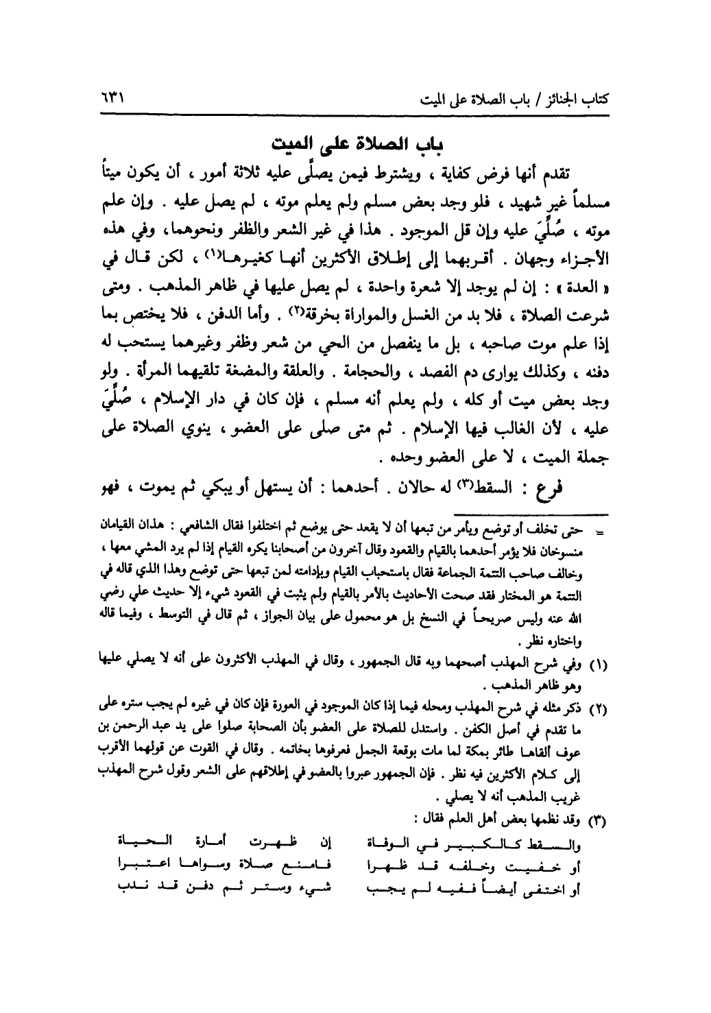 تقدم أنها فرض كفاية، ويشترط فيمن يصلى عليه ثلاثة أمور، أن يكون ميتا مسلما غير شهيد، فلو وجد بعض مسلم ولم يعلم موته، لم يصل عليه. وإن علم موته، صلي عليه وإن قل الموجود. هذا في غير الشعر والظفر ونحوهما، وفي هذه الاجزاء وجهان. أقربهما إلى إطلاق الاكثرين أنها كغيرها (1)، لكن قال في (العدة): إن لم يوجد إلا شعرة واحدة، لم يصل عليها في ظاهر المذهب. ومتى شرعت الصلاة، فلا بد من الغسل والمواراة بخرقة (2). وأما الدفن، فلا يختص بما إذا علم موت صاحبه، بل ما ينفصل من الحي من شعر وظفر وغيرهما يستحب له دفنه، وكذلك يوارى دم الفصد، والحجامة. والعلقة والمضغة تلقيهما المرأة. ولو وجد بعض ميت أو كله، ولم يعلم أنه مسلم، فإن كان في دار الاسلام، صلي عليه، لان الغالب فيها الاسلام. ثم متى صلى على العضو، ينوي الصلاة على جملة الميت، لا على العضو وحده. فرع: السقط (3) له حالان. أحدهما: أن يستهل أو يبكي ثم يموت، فهو