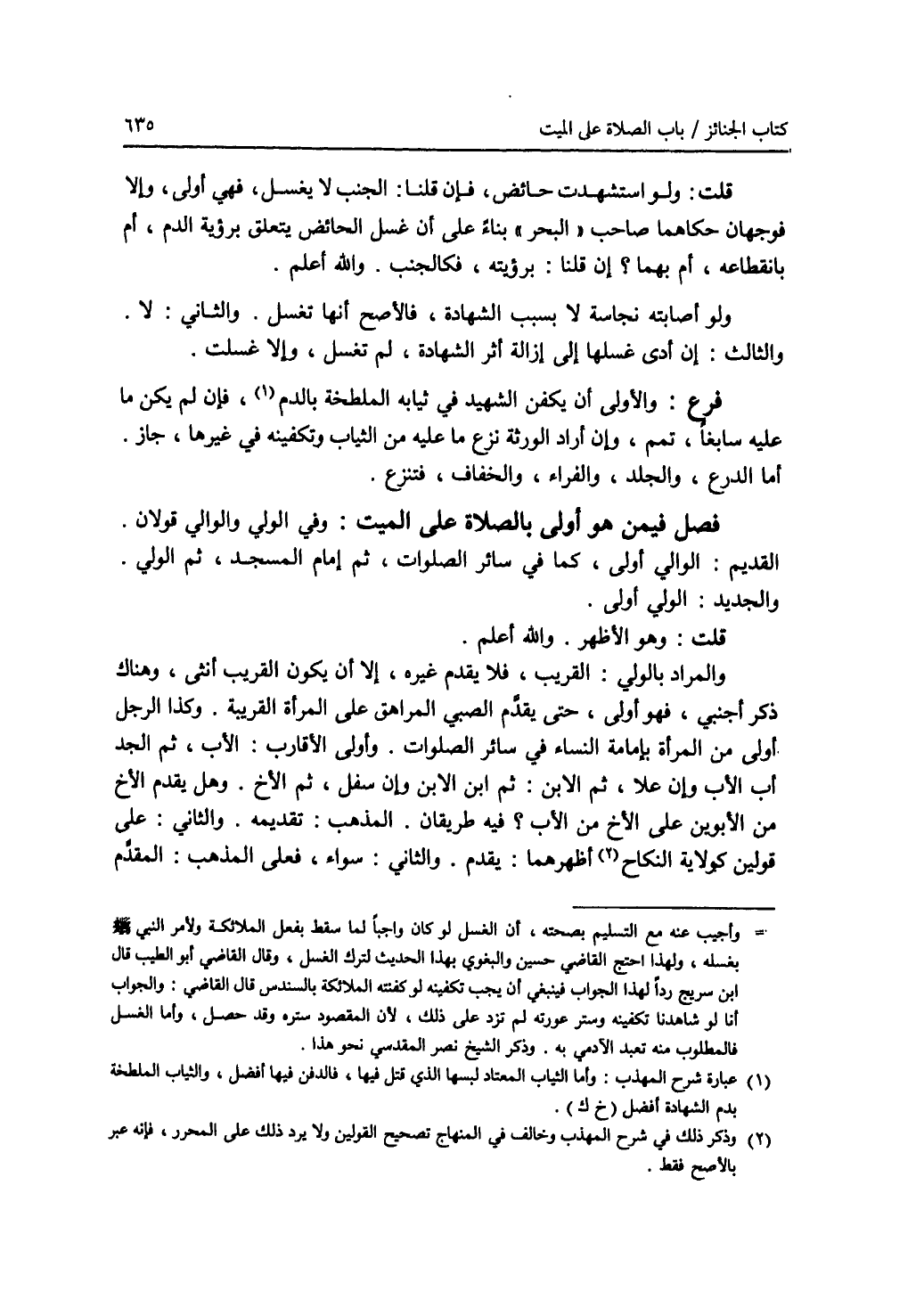 قلت: ولو استشهدت حائض، فإن قلنا: الجنب لا يغسل، فهي أولى، وإلا فوجهان حكاهما صاحب (البحر) بناء على أن غسل الحائض يتعلق برؤية الدم، أم بانقطاعه، أم بهما ؟ إن قلنا: برؤيته، فكالجنب. والله أعلم. ولو أصابته نجاسة لا بسبب الشهادة، فالاصح أنها تغسل. والثاني: لا. والثالث: إن أدى غسلها إلى إزالة أثر الشهادة، لم تغسل، وإلا غسلت. فرع: والاولى أن يكفن الشهيد في ثيابه الملطخة بالدم (1)، فإن لم يكن ما عليه سابغا، تمم، وإن أراد الورثة نزع ما عليه من الثياب وتكفينه في غيرها، جاز. أما الدرع، والجلد، والفراء، والخفاف، فتنزع. فصل فيمن هو أولى بالصلاة على الميت: وفي الولي والوالي قولان. القديم: الوالي أولى، كما في سائر الصلوات، ثم إمام المسجد، ثم الولي. والجديد: الولي أولى. قلت: وهو الاظهر. والله أعلم. والمراد بالولي: القريب، فلا يقدم غيره، إلا أن يكون القريب أنثى، وهناك ذكر أجنبي، فهو أولى، حتى يقدم الصبي المراهق على المرأة القريبة. وكذا الرجل أولى من المرأة بإمامة النساء في سائر الصلوات. وأولى الاقارب: الاب، ثم الجد أب الاب وإن علا، ثم الابن، ثم ابن الابن وإن سفل، ثم الاخ. وهل يقدم الاخ من الابوين على الاخ من الاب ؟ فيه طريقان. المذهب: تقديمه. والثاني: على قولين كولاية النكاح (2). أظهرهما: يقدم. والثاني: سواء، فعلى المذهب: المقدم