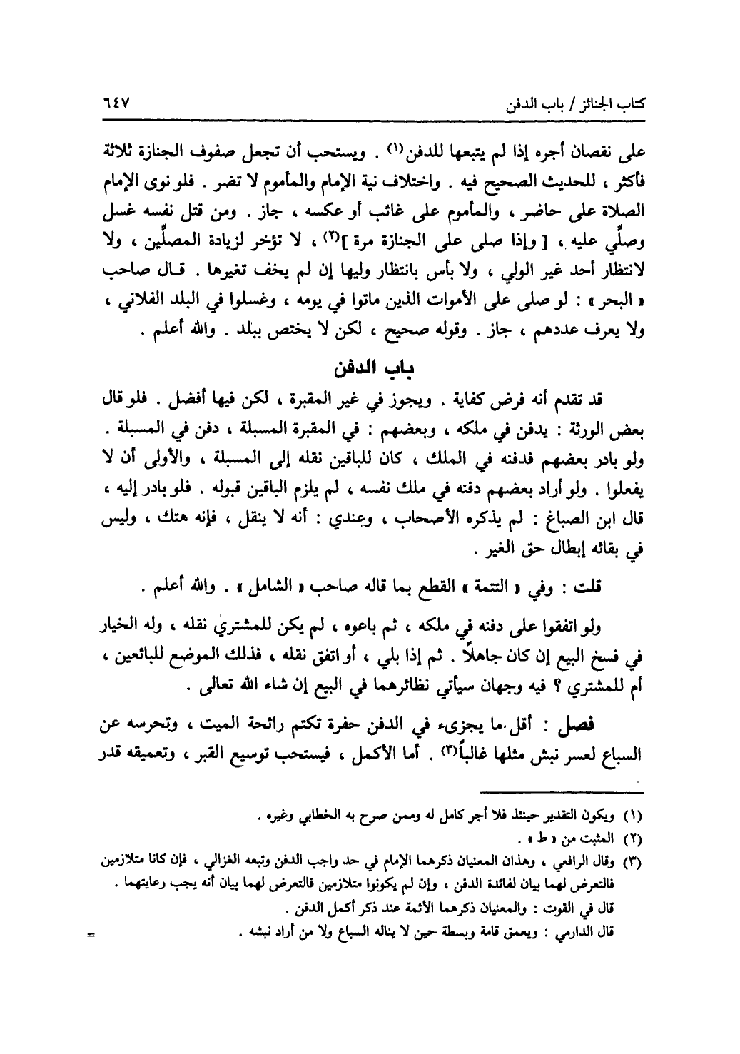 على نقصان أجره إذا لم يتبعها للدفن (1). ويستحب أن تجعل صفوف الجنازة ثلاثة فأكثر، للحديث الصحيح فيه. واختلاف نية الامام والمأموم لا تضر. فلو نوى الامام الصلاة على حاضر، والمأموم على غائب أو عكسه، جاز. ومن قتل نفسه غسل وصلي عليه، [ وإذا صلى على الجنازة مرة ] (2) لا تؤخر لزيادة المصلين، ولا لانتظار أحد غير الولي، ولا بأس بانتظار وليها إن لم يخف تغيرها. قال صاحب (البحر): لو صلى على الاموات الذين ماتوا في يومه، وغسلوا في البلد الفلاني، ولا يعرف عددهم، جاز. وقوله صحيح، لكن لا يختص ببلد. والله أعلم.