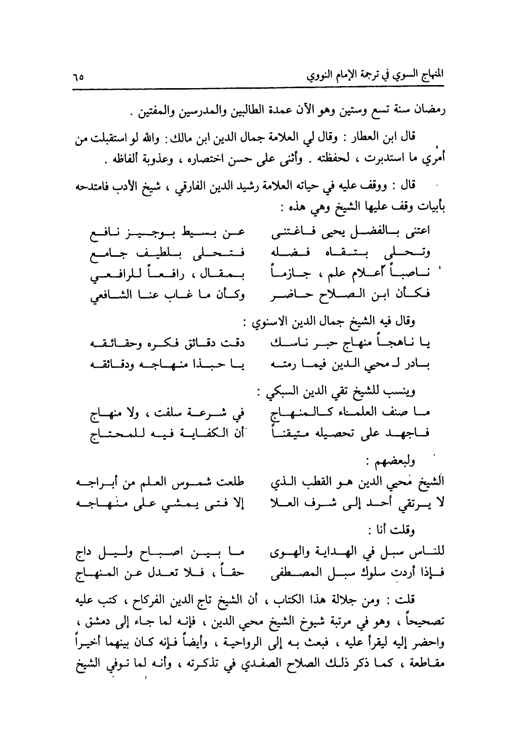 رمضان سنة تسع وستين وهو الآن عمدة الطالبين والمدرسين والمفتين. قال ابن العطار: وقال لي العلامة جمال الدين ابن مالك: والله لو استقبلت من أمري ما استدبرت، لحفظته. وأثنى على حسن اختصاره، وعذوبة ألفاظه. قال: ووقف عليه في حياته العلامة رشيد الدين الفارقي، شيخ الادب فامتدحه بأبيات وقف عليها الشيخ وهي هذه: عتنى بالفضل يحيى فاغتنى * عن بسيط بوجيز نافع وتحلى بتقاه فضله * فتحلى بالطيف جامع ناصيا أعلام علم، جازما * بمقال، رافعا للرافعي فكأن ابن الصلاح حاضر * وكأن ما غاب عنا الشافعي وقال فيه الشيخ جمال الدين الاسنوي: يا ناهجا منهاج حبر ناسك * دقت دقائق فكره وحقائقه بادر ل محيى الدين فيما رمته * ياحبذا منهاجه ودقائقه وينسب للشيخ تقي الدين السبكي: ما صنف العلماء كالمنهاج * في شرعة سلفت، ولا منهاج فاجهد على تحصيله متيقنا * أن الكفاية فيه للمحتاج ولبعضهم: الشيخ محيي الدين هو القطب الذي * طلعت شموس العلم من أبراجه لا يرتقي أحد إلى شرف العلا * إلا فتى يمشي على منهاجه وقلت أنا: للناس سبل في الهداية والهوى * ما بين اصباح وليل داج فإذا أردت سلوك سبل المصطفي * حقا، فلا تعدل عن المنهاج قلت: ومن جلالة هذا الكتاب، أن الشيخ تاج الدين الفركاح، كتب عليه تصحيحا، وهو في مرتبة، شيوخ الشيخ محيي الدين، فإنه لما جاء إلى دمشق، واحضر إليه ليقرأ عليه، فبعث به إلى الرواحية، وأيضا فإنه كان بينهما أخيرا مقاطعة، كما ذكر ذلك الصفدي في تذكرته، وأنه لما توفي الشيخ