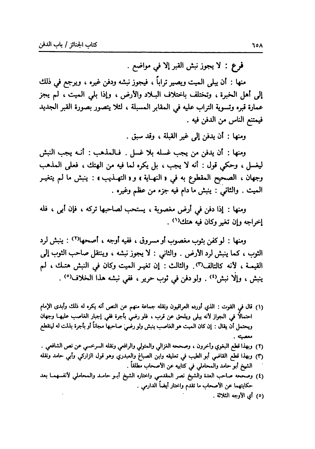 فرع: لا يجوز نبش القبر إلا في مواضع. منها: أن يبلى الميت ويصير ترابا، فيجوز نبشه ودفن غيره، ويرجع في ذلك إلى أهل الخبرة، وتختلف باختلاف البلاد والارض، وإذا بلي الميت، لم يجز عمارة قبره وتسوية التراب عليه في المقابر المسبلة، لئلا يتصور بصورة القبر الجديد فيمتنع الناس من الدفن فيه. ومنها: أن يدفن إلى غير القبلة، وقد سبق. ومنها: أن يدفن من يجب غسله بلا غسل. فالمذهب: أنه يجب النبش ليغسل، وحكي قول: أنه لا يجب، بل يكره لما فيه من الهتك، فعلى المذهب وجهان، الصحيح المقطوع به في (النهاية) و (التهذيب): ينبش ما لم يتغير الميت. والثاني: ينبش ما دام فيه جزء من عظم وغيره. ومنها: إذا دفن في أرض مغصوبة، يستحب لصاحبها تركه، فان أبى، فله إخراجه وإن تغير وكان فيه هتك (1). ومنها: لو كفن بثوب مغصوب أو مسروق، ففيه أوجه، أصحها (2): ينبش لرد الثوب، كما ينبش لرد الارض. والثاني: لا يجوز نبشه، وينتقل صاحب الثوب إلى القيمة، لانه كالتالف (3). والثالث: إن تغير الميت وكان في النبش هتك، لم ينبش، وإلا نبش (4). ولو دفن في ثوب حرير، ففي نبشه هذا الخلاف (5).