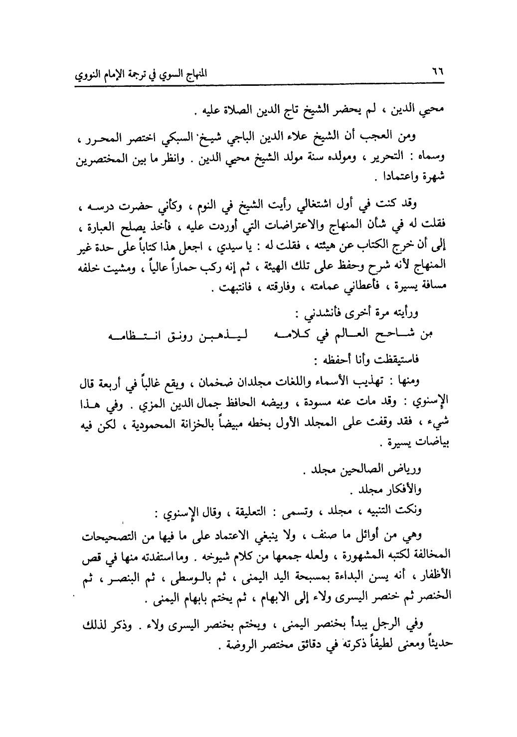 محيي الدين، لم يحضر الشيخ تاج الدين الصلاة عليه. ومن العجب أن الشيه علاء الدين الباجي شيخ السبكي اختصر المحرر، وسماه: التحرير، ومولده سنة مولد محيي الدين. وانظر ما بين المختصرين شهرة واعتمادا. وقد كنت في أول اشتغالي رأيت الشيخ في النوم، وكأني حضرت درسه، فقلت له في شأن المنهاج والاعتراضات التي أوردت عليه، فأخذ يصلح العبارة، إلى أن خرج عن هيئته، فقلت له: يا سيدي، اجعل هذا كتابا على حدة غير المنهاج لانه شرح وحفظ على تلك الهيئة، ثم إنه ركب حمارا عاليا، ومشيت خلفه مسافة يسيره، فأعطاني عمامته، وفارقته، فانتبهت. ورأيته مرة أخرى فأنشدني: من شاحح العالم في كلامه ليذهبن رونق انتظامه فاستيفظت وأنا أحفظه: ومنها: تهذيب الاسماء واللغات مجلدان ضخمان، ويقع غالبا في أربعة قال الاسنو: وقد مات عنه مسودة، وبيضه الحافظ جمال الدين، المزي. وفي هذا شئ، فقد وقفت على المجلد الاول بخطه مبيضا بالخزانة المحمودية، لكن فيه بياضات يسيرة. ورياض الصالحين مجلد. والافكار مجلد. ونكت التنبيه، مجلد، وتسمى: التعليقة، وقال الاسنوي: وهي من أوائل ما صنف، ولا ينبغي الاعتماد على ما فيها من التصحيحات المخالفة لكتبه المشهورة، ولعله جمعها من كلام شيوخه. وما استفدته منها في قص الاظفار، أنه يسن البداءة بمسبحة اليد اليمنى، ثم بالوسطى، ثم البنصر، ثم الخنصر ثم خنصر اليس ولاء الابهام، ثم يختم بابهام اليمنى. وفي الرجل يبدأ بخنصر اليمنى، ويختم بخنصر اليسرى ولاء، وذكر لذلك حديثا ومعنى لطيفا ذكرته في دقائق مختصر الروضة.