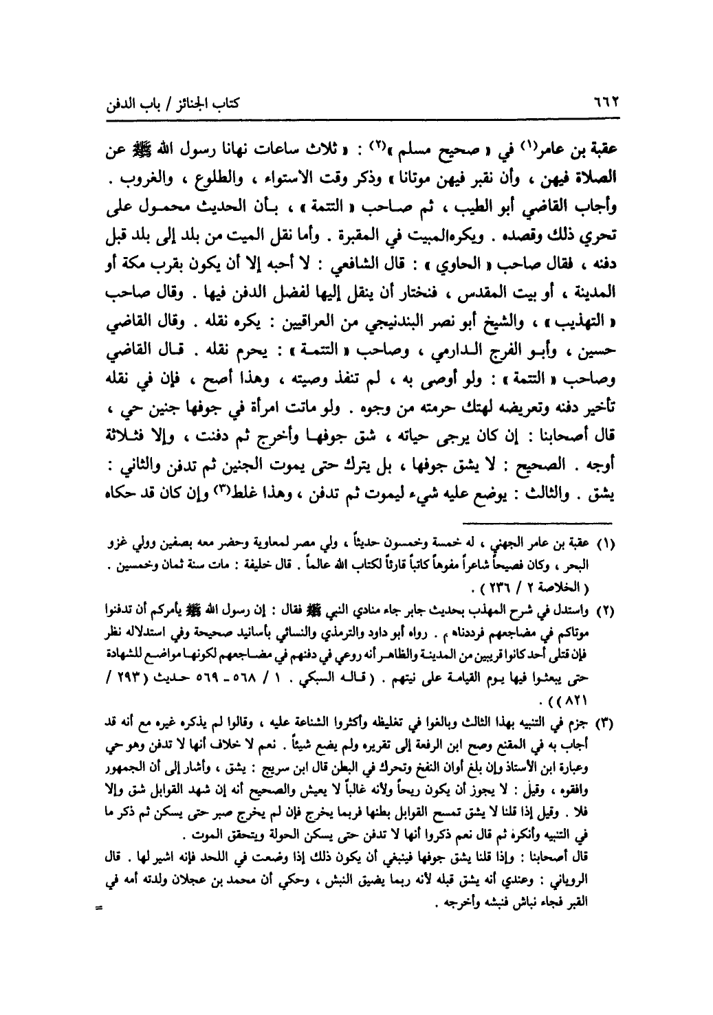 عقبة بن عامر (1) في (صحيح مسلم) (2): (ثلاث ساعات نهانا رسول الله - صلى الله عليه وسلم - عن الصلاة فيهن، وأن نقبر فيهن موتانا) وذكر وقت الاستواء، والطلوع، والغروب. وأجاب القاضي أبو الطيب، ثم صاحب (التتمة)، بأن الحديث محمول على تحري ذلك وقصده. ويكره المبيت في المقبرة. وأما نقل الميت من بلد إلى بلد قبل دفنه، فقال صاحب (الحاوي) قال الشافعي: لا أحبه إلا أن يكون بقرب مكة أو المدينة، أو بيت المقدس، فنختار أن ينقل إليها لفضل الدفن فيها. وقال صاحب (التهذيب)، والشيخ أبو نصر البندنيجي من العراقيين: يكره نقله. وقال القاضي حسين، وأبو الفرج الدارمي، وصاحب (التتمة): يحرم نقله. قال القاضي وصاحب (التتمة): ولو أوصى به، لم تنفذ وصيته، وهذا أصح، فإن في نقله تأخير دفنه وتعريضه لهتك حرمته من وجوه. ولو ماتت امرأة في جوفها جنين حي، قال أصحابنا: إن كان يرجى حياته، شق جوفها وأخرج ثم دفنت، وإلا فثلاثة أوجه. الصحيح: لا يشق جوفها، بل يترك حتى يموت الجنين ثم تدفن. والثاني: يشق. والثالث: يوضع عليه شئ ليموت ثم تدفن، وهذا غلط (3) وإن كان قد حكاه