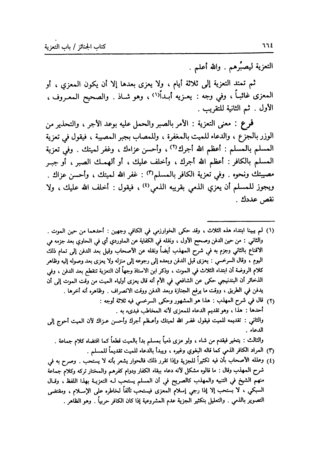 التعزية ليصبرهم. والله أعلم. ثم تمتد التعزية إلى ثلاثة أيام، ولا يعزى بعدها إلا أن يكون المعزي، أو المعزى غائبا. وفي وجه: يعزيه أبدا (1)، وهو شاذ. والصحيح المعروف، الاول. ثم الثانية للتقريب. فرع: معنى التعزية: الامر بالصبر والحمل عليه بوعد الاجر، والتحذير من الوزر بالجزع، والدعاء للميت بالمغفرة، وللمصاب بجبر المصيبة، فيقول في تعزية المسلم بالمسلم: أعظم الله أجرك (2)، وأحسن عزاءك، وغفر لميتك. وفي تعزية المسلم بالكافر: أعظم الله أجرك، وأخلف عليك، أو ألهمك الصبر، أو جبر مصيبتك ونحوه. وفي تعزية الكافر بالمسلم (3): غفر الله لميتك، وأحسن عزاك. ويجوز للمسلم أن يعزي الذمي بقريبه الذمي (4)، فيقول: أخلف الله عليك، ولا نقص عددك.