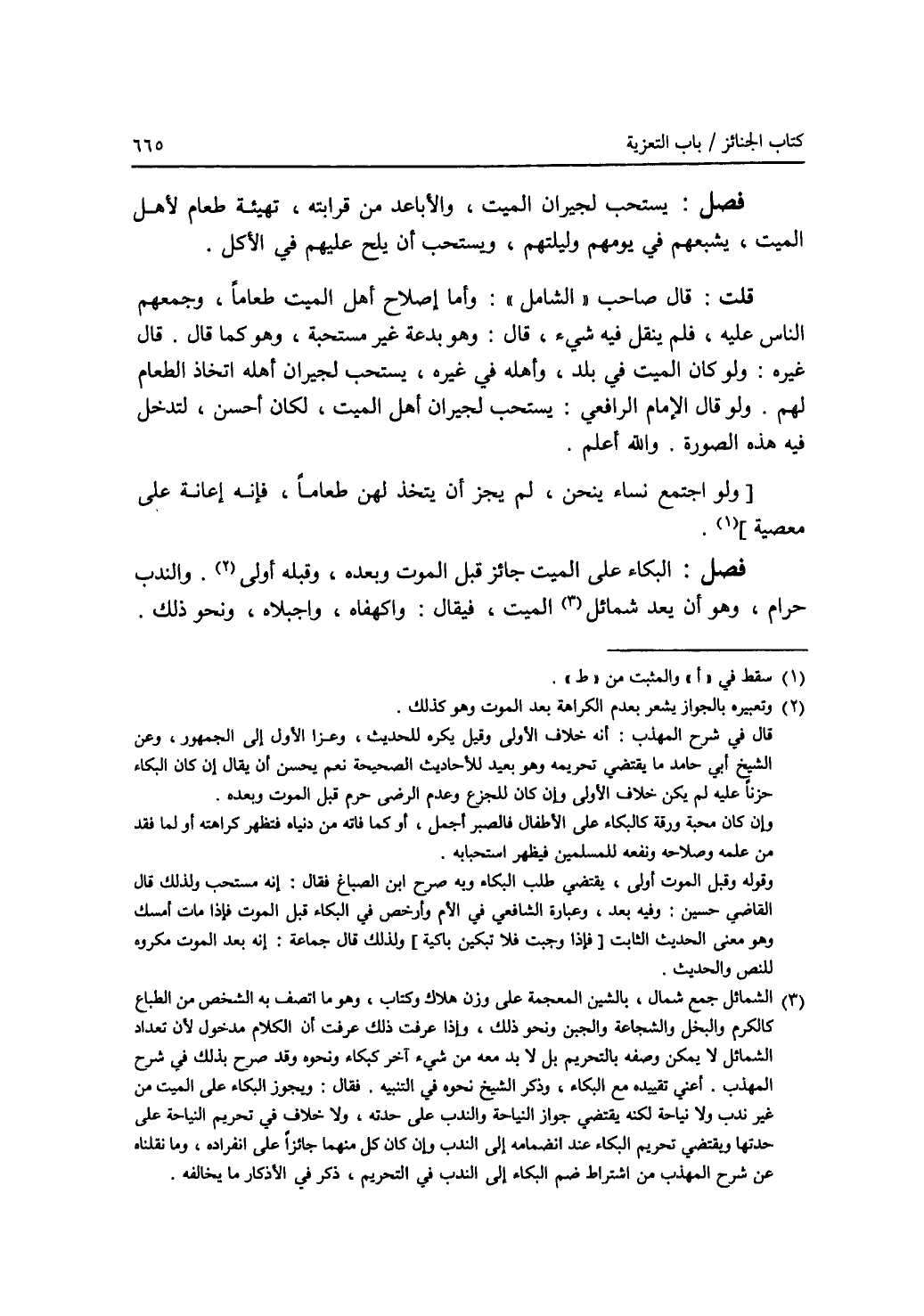 فصل: يستحب لجيران الميت، والاباعد من قرابته، تهيئة طعام لاهل الميت، يشبعهم في يومهم وليلتهم، ويستحب أن يلح عليهم في الاكل. قلت: قال صاحب (الشامل) وأما إصلاح أهل الميت طعاما، وجمعهم الناس عليه، فلم ينقل فيه شئ، قال: وهو بدعة غير مستحبة، وهو كما قال. قال غيره: ولو كان الميت في بلد، وأهله في غيره، يستحب لجيران أهله اتخاذ الطعام لهم. ولو قال الامام الرافعي: يستحب لجيران أهل الميت، لكان أحسن، لتدخل فيه هذه الصورة. والله أعلم. [ ولو اجتمع نساء ينحن، لم يجز أن يتخذ لهن طعاما، فإنه إعانة على معصية ] (1). فصل: البكاء على الميت جائز قبل الموت وبعده، وقبله أولى (2). والندب حرام، وهو أن يعد شمائل (3) الميت، فيقال: واكهفاه، واجبلاه، ونحو ذلك.