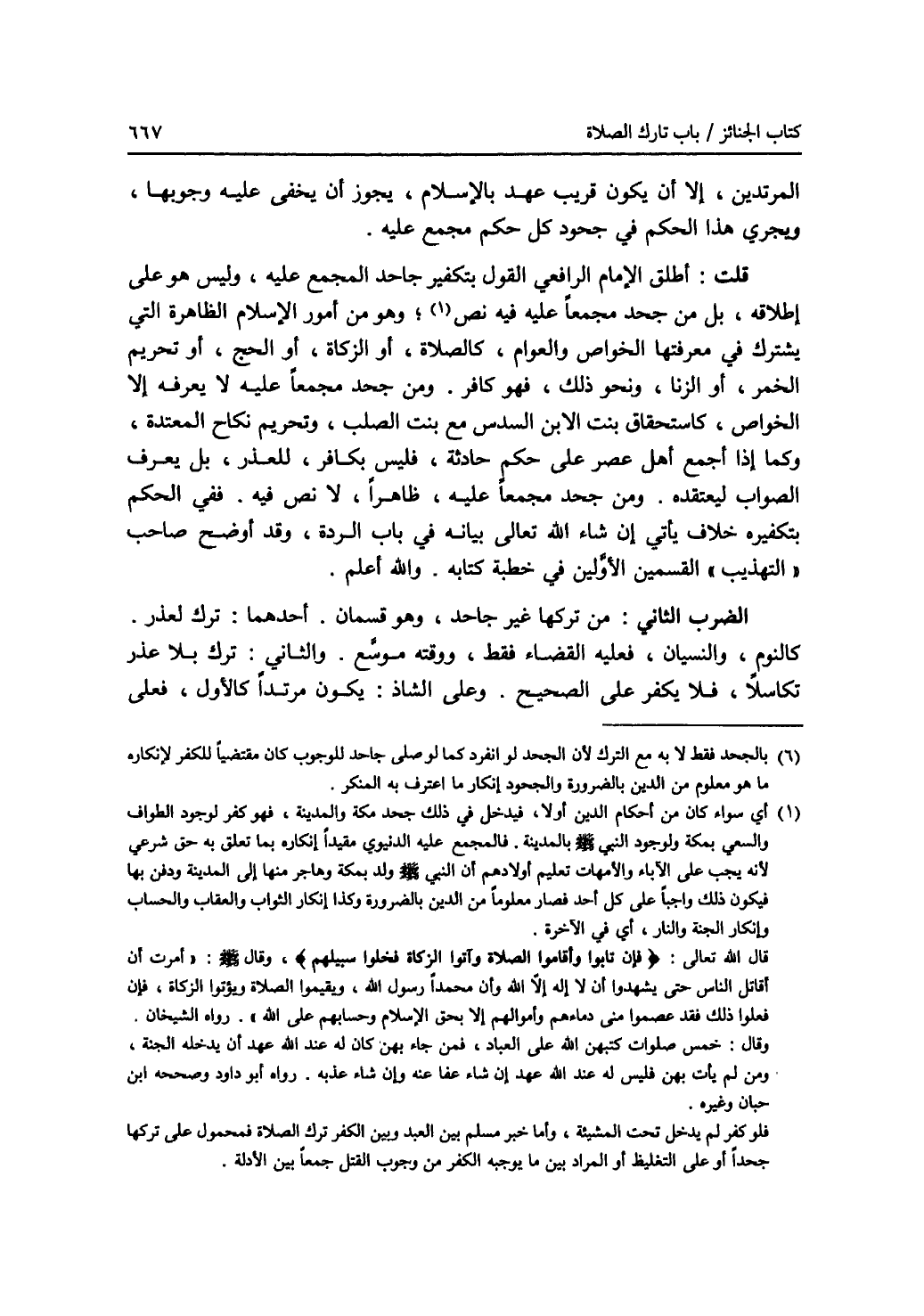 المرتدين، إلا أن يكون قريب عهد بالاسلام، يجوز أن يخفى عليه وجوبها، ويجري هذا الحكم في جحود كل حكم مجمع عليه. قلت: أطلق الامام الرافعي القول بتكفير جاحد المجمع عليه، وليس هو على إطلاقه، بل من جحد مجمعا عليه فيه نص (1)، وهو من أمور الاسلام الظاهرة التي يشترك في معرفتها الخواص والعوام، كالصلاة، أو الزكاة، أو الحج، أو تحريم الخمر، أو الزنا، ونحو ذلك، فهو كافر. ومن جحد مجمعا عليه لا يعرفه إلا الخواص، كاستحقاق بنت الابن السدس مع بنت الصلب، وتحريم نكاح المعتدة، وكما إذا أجمع أهل عصر على حكم حادثة، فليس بكافر، للعذر، بل يعرف الصواب ليعتقده. ومن جحد مجمعا عليه، ظاهرا، لا نص فيه. ففي الحكم بتكفيره خلاف يأتي إن شاء الله تعالى بيانه في باب الردة، وقد أوضح صاحب (التهذيب) القسمين الاولين في خطبة كتابه. والله أعلم. الضرب الثاني: من تركها غير جاحد، وهو قسمان. أحدهما: ترك لعذر، كالنوم، والنسيان، فعليه القضاء فقط، ووقته موسع. والثاني: ترك بلا عذر تكاسلا، فلا يكفر على الصحيح. وعلى الشاذ: يكون مرتدا كالاول، فعلى