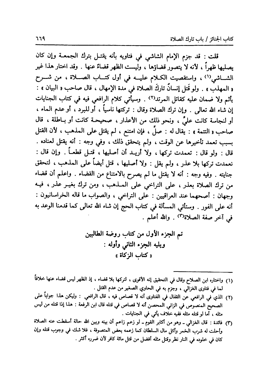 تم الجزء الأول من كتاب روضة الطالبين ويليه الجزء الثاني وأوله كتاب الزكاة
