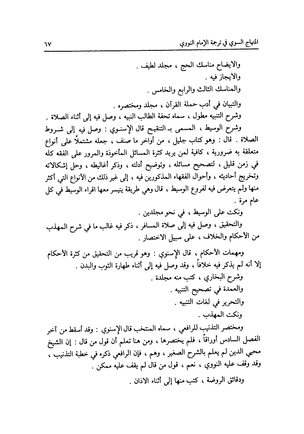 ولايضاح مناسك الحج، مجلد الطيف. والايجاز فيه. والمناسك الثالث والرابع والخامس. والتبيان في أدب حملة القرآن، مجلد ومختصره. وشرح التنبيه مطول، سماه تحفة الطالب النبيه، وصل فيه إلى أثناه الصلاة. وشرح الوسيط، المسمى ب التنقيح قال الاسنوي: وصل فيه إلى شروط الصلاة. قال: وهو كتاب جليل، من أواخر ما صنف، جعله مشتملا على أنواع متعلقة به ضرورية، كافية لمن يريد كثرة المسائل المأخوذة والمرور على الفقه كله في زمن قليل، لتصحيح مسائله، وتوضيح أدلته، وذكر غير ذلك من الانواع التي أكثر منها ولم يتعرض فيه لفروع الوسيط، قال وهي طريقة يتيسر معها اقراء الوسيط في كل عام مرة. ونكت على الوسيط، في نحو مجلدين. والتحقيق، وصل فيه إلى صلاة المسافر، ذكر فيه غالب ما في شرح المهذب ما الاحكام والخلاف، على سبيل الاختصار. ومهمات الاحكام، قال الاسنوي: وهو قريب من التحقيق من كثرة الاحكام إلا أنه لم يذكر فيه خلافا، وقد وصل فيه إلى أثنا طهارة الثوب والبدن. وشرح البخاري، كتب منه مجلدة. والعمدة في تصحيح التنبيه. والتحرير في لغات التنبيه. ونكت المهذب. ومختصر التذنيب للرافعي، سماه المنتخب قال الاسنوي: وقد أسقط من آخر الفصل السادس أوراقا، فلم يختصرها، ومن هنا تعلم أن قول من قال: إن الشيخ محيي وقف على النووي، نعم قول من الرافعي ذكره في خطبة التذنيب، وقد وقف عليه النووي: نعم، من قال يقف عليه ممكن. ودقائق الروضة. كتب منها إلى أثناه الاذان.