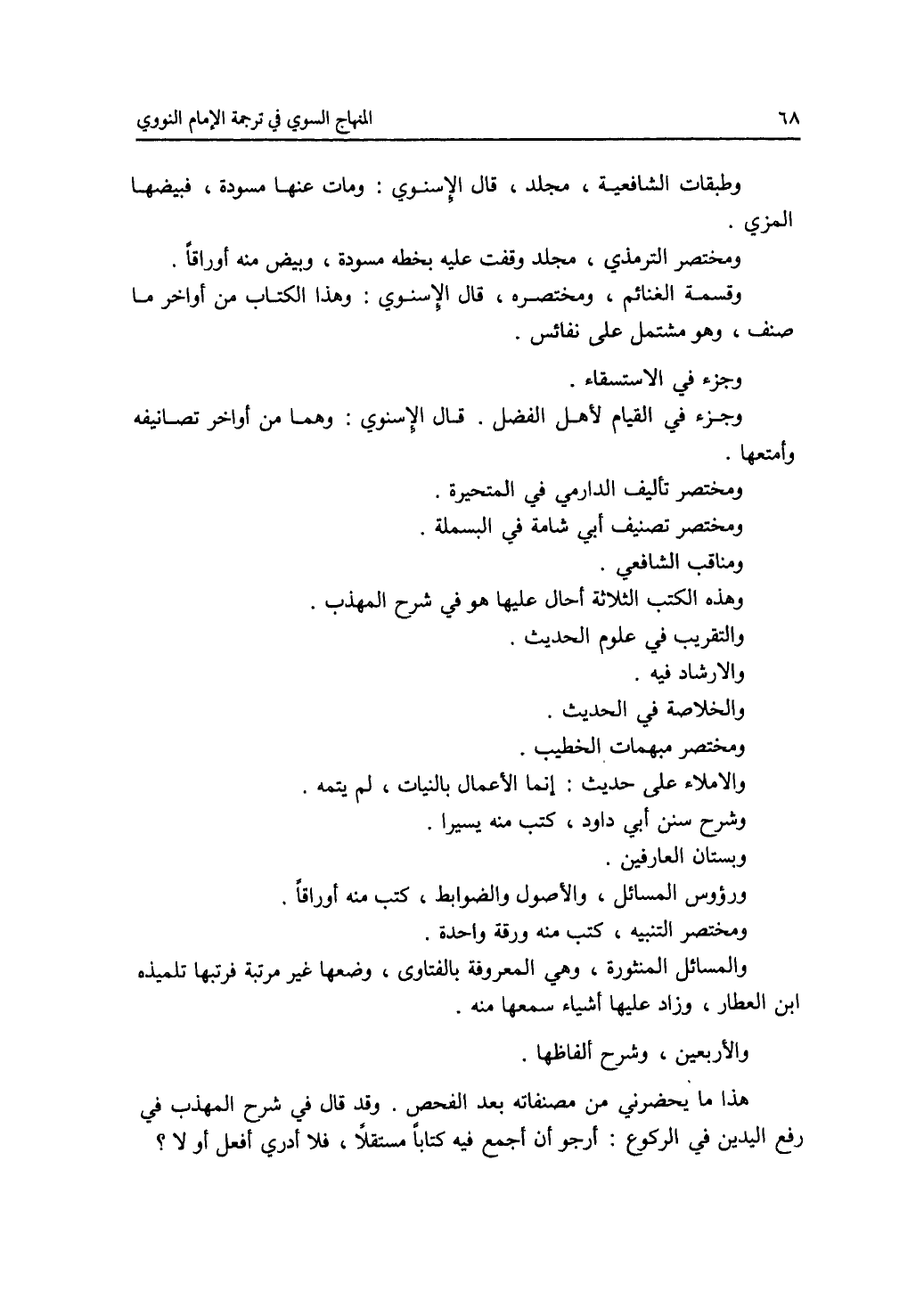 وطبقات الشافعية، مجلد، قال الاسنوي: ومات عنها مسودة، فبيضها المزي. وختصر الترمذي، مجلد وقفت عليه بخطه مسودة، وبيض منه أوراقا. وقسمه الغنائم، ومختصره، قال الاسنوي: وهذا الكتاب من أواخر ما صنف، وهو مشتمل على نفائس. وجزء في القيام لاهل الفضل. قال الاسنوي: وهما من أواخر تصانيفه وأمتعها. ومختصر تأليف الدارمي في المحيرة. ومختصر تصنيف أبي شامة في البسملة. ومناقب الشافعي. وهذه الكتب الثلاثة أحال عليها هو في شرح المهذب. والتقريب في علوم الحديث. والارشاد فيه. والخلاصة في الحديث. ومختصر مبهمات الخطيب. والاملاء على حديث: إنما الاعمال بالنيات، لم يتمه. وشرح سنن أبي داود، كتب منه يسيرا. وبستان العارفين. ورؤوس المسائل، والاصول والضوابط، كتب منه أوراقا. ومختصر التنبيه، كتب منه روقة واحدة. والمسائل المنثورة، وهي المعروفة بالفتاوى، وضعها غير مرتبة فرتبها تلميذه. ابن العطار، وزاد عليها أشياء سمعها منه. والاربعين، وشرح ألفاظها. هذا ما يحضرني من مصنفاته بعد الفحض. وقد قال في شرح المهذب في رفع اليدين في الركوع: أرجو أن أجمع فيه كتابا مستقلا، فلا أدري أفعل أولا ؟