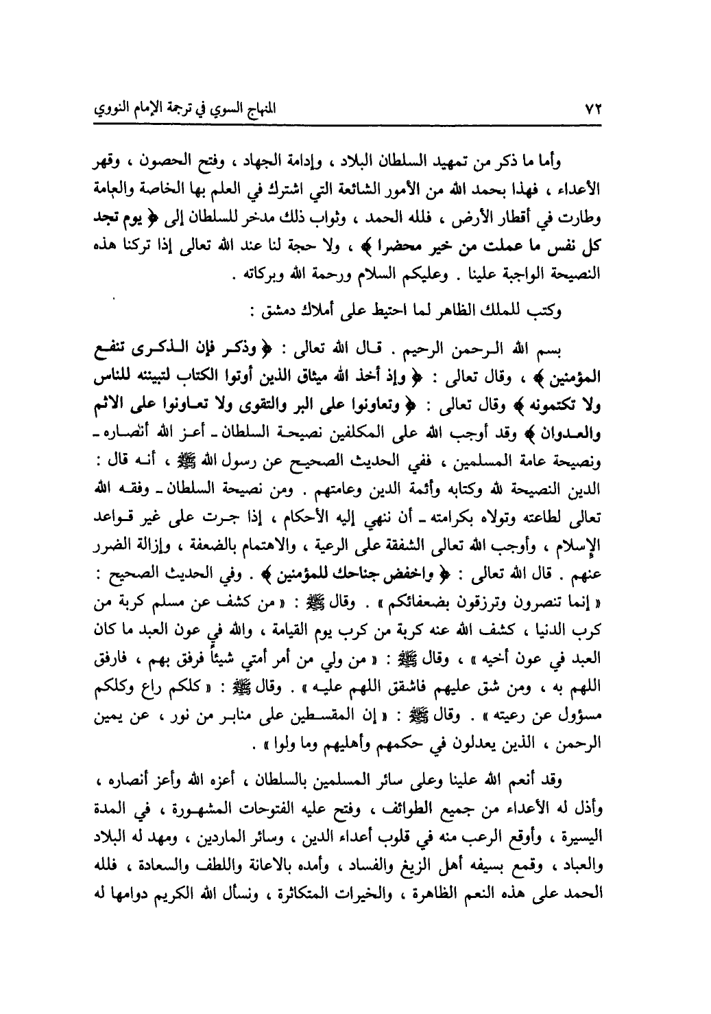 وأما ما ذكر من تمهد السلطان البلاد، وإدامة الجهاد، وفتح الحصون، وقهر الاعداء، فهذا بحمد الله من الامور الشائعة التي اشترك في العلم بها الخاصة والعامة وطارت في أقطار الارض، فلله الحمد، وثواب ذلك مدخر للسطان إلى * (يوم تجد كل نفس من خير محضرا) *، ولا حجة لنا عند الله تعالى إذا تركنا هذه النصيحد الواجبة علينا. وعليكم السلام ورحمة الله وبركاته. وكتب للملك الظاهر لما احتيط على أملاك دمشق: بسم الله الرحمن الرحيم. قال الله تعالى: * (وذكر فإن الذكرى تنفع المؤمنين) * وقال تعالى: * (وإذ أخذ الله ميثاق الذين أوتوا الكتاب لتبيننه للناس ولا تكتمونه) * وقال تعالى: * (وتعاونوا على البر والتقوى ولا تعاونوا على الاثم والعدوان) * وقد أوجب الله على المكلفين نصيحد السلطان - أعز الله أنصاره - ونصيحة عامة المسلمين، ففي الحديث الصحيح عن رسول الله صلى الله عليه وسلم، أنه قال: الدين النصيحة لله وكتابه وأئمة الدين وعامتهم. ومن نصيحة السلطان - وفقه الله تعالى لطاعته وتولاه بكرامته - أن ننهي إليه الاحكام، إذا جرت على غير قواعد الاسلام، وأوجب الله تعالى الشفقة على الرعية، والاهتمام بالضعفة، إزالة الضرر عنهم. قال الله تعالى: * (واخفض جناحك للمؤمنين) *. وفي الحديث الصحيح. (إنما تنصرون وترزقون بضعفائكم). وقال صلى الله عليه وسلم: (من كشف عن مسلم كربة من كرب الدينا، كشف الله عنه كربة من كرب يوم القيامة، والله في عون العبد ما كان العبد في عون أخيه) وقال صلى الله عليه وسلم: (من ولي من أمر أمتي شيئا فرفق بهم، فارفق اللهم به، ومن شق عليهم فاشقق اللهم عليه). وقال صلى الله عليه وسلم: (كلكم راع وكلكم مسؤول عن رعيته). صلى الله عليه وسلم: (إن المقسطين على منابر من نور، عن يمين الرحمن، الذين يعدلون في حكمهم وأهليهم وما ولوا). وقد أنعم الله علينا وعلى سائر المسلمين بالسطان، أعزه الله وأعز أنصاره، وأذل له الاعداء من جميع الطوائف، وفتح أعداء الدين، وسائر الماردين، ومهد له البلاد والعباد، وقمع بسيقه أهل الزيغ والفساد، وأمده بالاعانة واللطف والسعادة، فلله الحمد على هذه النعم الظاهره، والخيرات المتكاثرة، ونسأل الله الكريم دوامها له